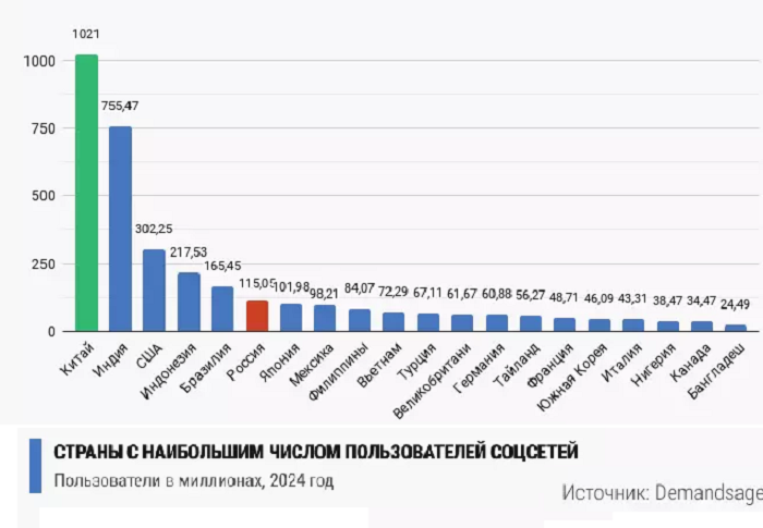 Россия занимает 6- ое место по количеству пользователей соцсетей.