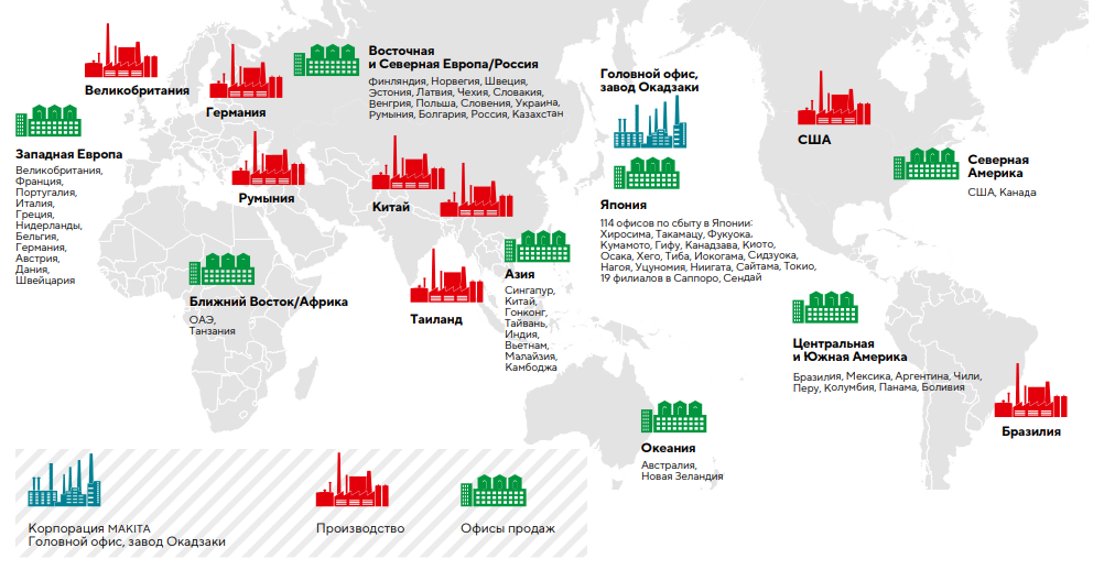Сегодня Makita — мировой лидер с представительствами в 50 странах и заводами по всему миру. Более 1000 наименований инструментов, Качество в каждой детали.