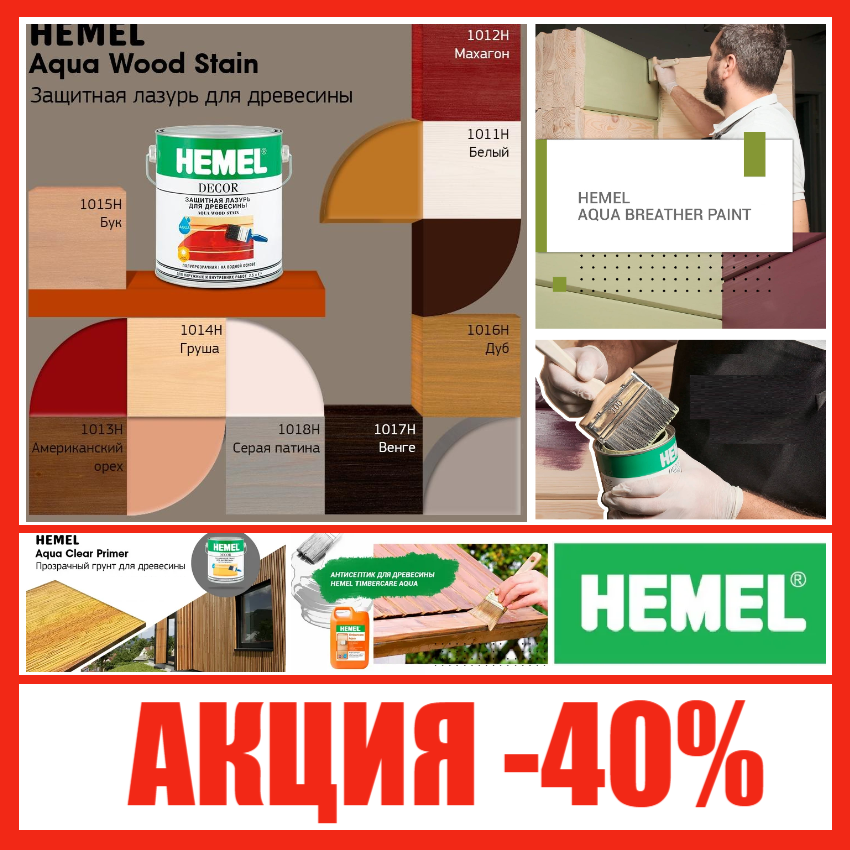 Hemel бренд с 50 - летней историей и широким ассортиментом инновационных покрытий для защиты и окрашивания древесины. Краски и масла HEMEL известны своей экологичностью, высоким качеством и надежной защитой дерева от влаги, УФ - лучей и механических повреждений. АКЦИЯ!