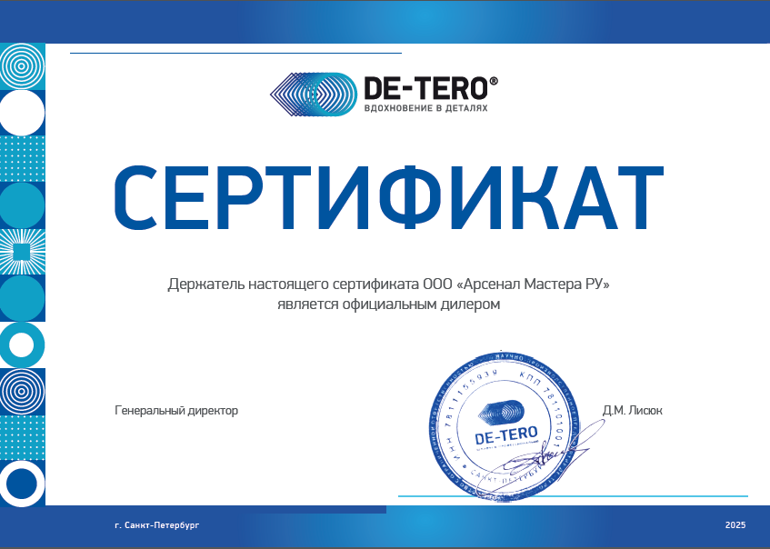 Сертификат официального дилера по продаже DE-TERO (ДЕ-ТЕРО) : расходный инструмент для электроинструментов, профессиональные щетки для обработки дерева: зачистка, браширование, текстурирование, шлифовка.