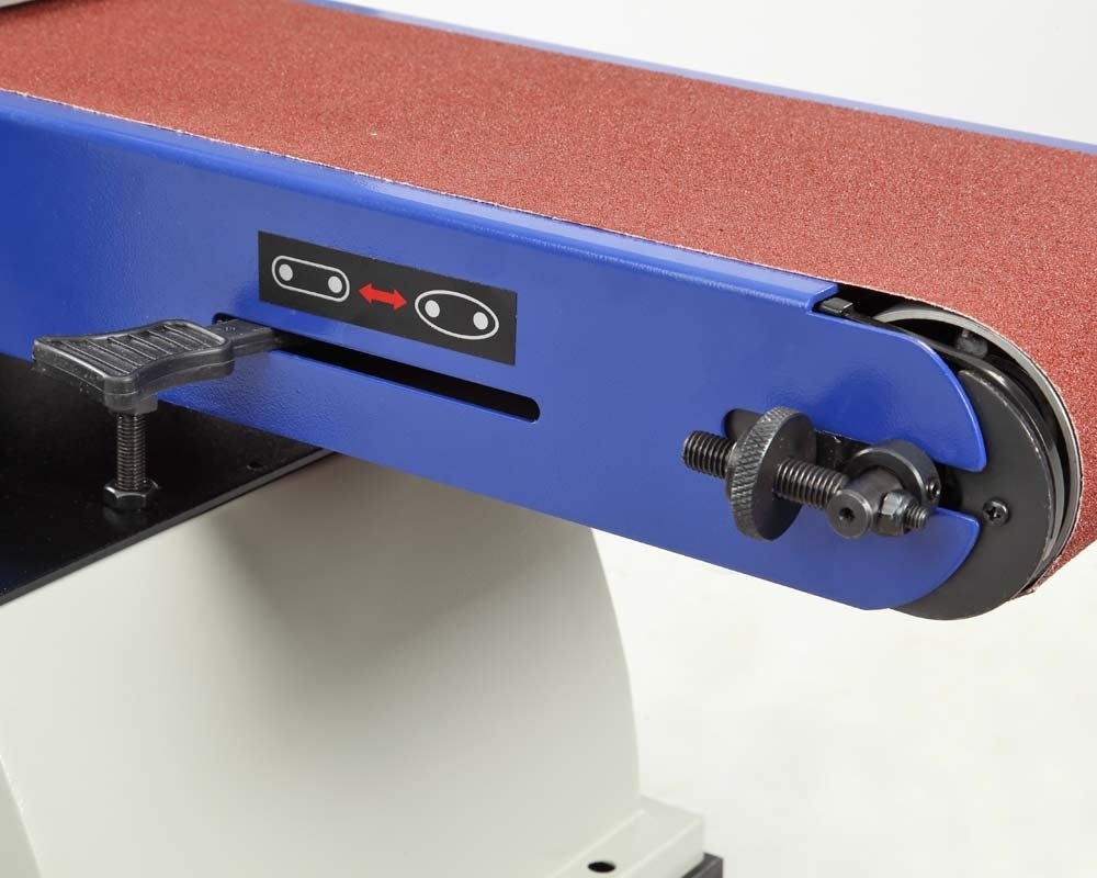 Абразивные материалы стандартные: лента – 1219x152 мм, диск – O228 мм. Станок надежно удерживается на верстаке за счет опор-виброгасителей, но для дополнительной безопасности его можно закрепить. Для этого на опорной платформе предусмотрены 4 отверстия.