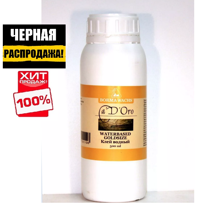 Водная эмульсия Borma Wachs WATERBASED GOLDSIZE представляет собой акриловый водоразбавимый клей для наклеивания золотого листа (потали). Применяется только при работах внутри помещений. Полученная золотая поверхность матовая, для глянцевого золочения не подходит. Состав готов к применению. Перед использованием проведите ряд тестов.