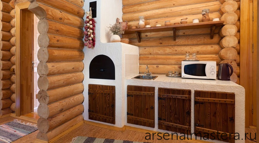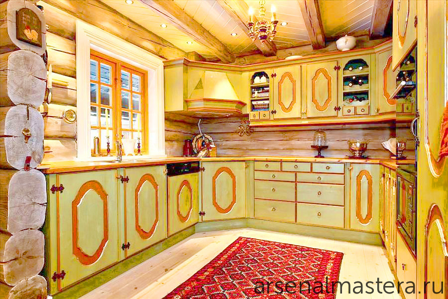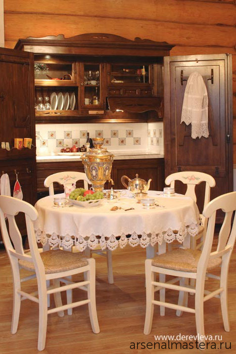 Интерьер кухни в рубленном русском доме в Подмосковье: национальный характер легко опознать по настоящей русской печи, картину дополняют кружевные скатерти, салфетки и прочее оформление в стиле «кантри». Изумительная итальянская мебель, вручную расписанная специально под этот интерьер, не только красива, но и функциональна. Так, мини-кухня на фото легко трансформируется в шкаф.