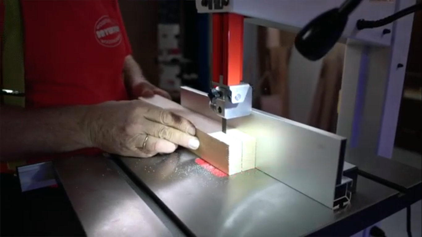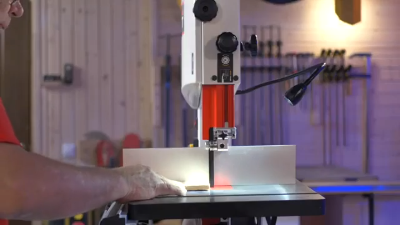 Имеет максимальное для своего класса оснащение. Кроме привычных обязательных функций и настроек, у нее есть и все вспомогательные. Среди них рычаг для быстрого ослабления и натяжения полотна, позволяет одним движением переводить станок из состояния хранения в рабочее. Светодиодная подсветка рабочей области с гибким штативом. Патрубок аспирации со ступенчатым подключением шланга D 50, 75 или 100 мм. Опорная подставка, может быть снята в случае настольного размещения