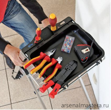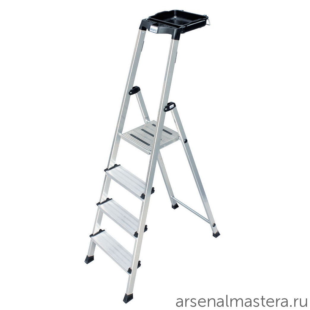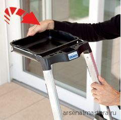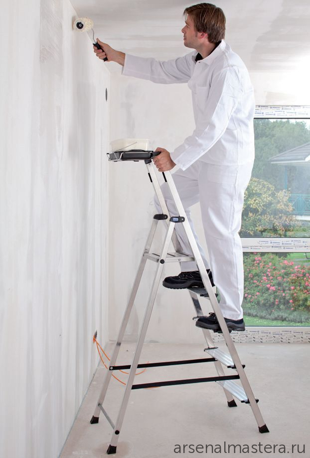 Компактная алюминиевая стремянка с практически неограниченными возможностями размещения инвентаря, позволяющими избежать частых подъемов и спусков. Универсальная стремянка Krause SECURY облегчит проведение ремонтных, строительных работ, например, покраску помещения с высокими стенами.