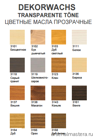 Цветное прозрачное масло из серии: Dekorwachs Transparent Töne - универсальное покрытие для древесины.