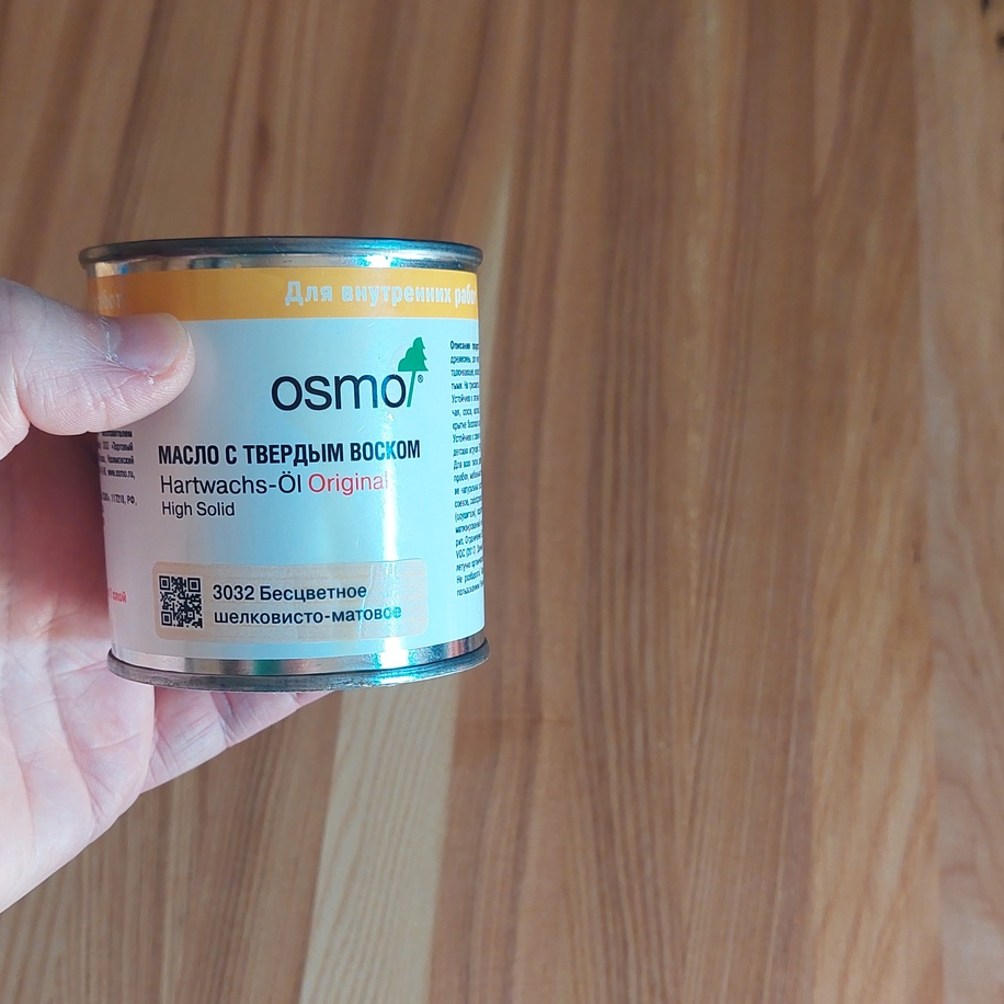 Чтобы усилить степень блеска, после полного высыхания нанесите на поверхность тонкий слой Osmo-средства для ухода и очистки древесины Wachspflegeund Reinigungsmittel и после высыхания отполируйте.