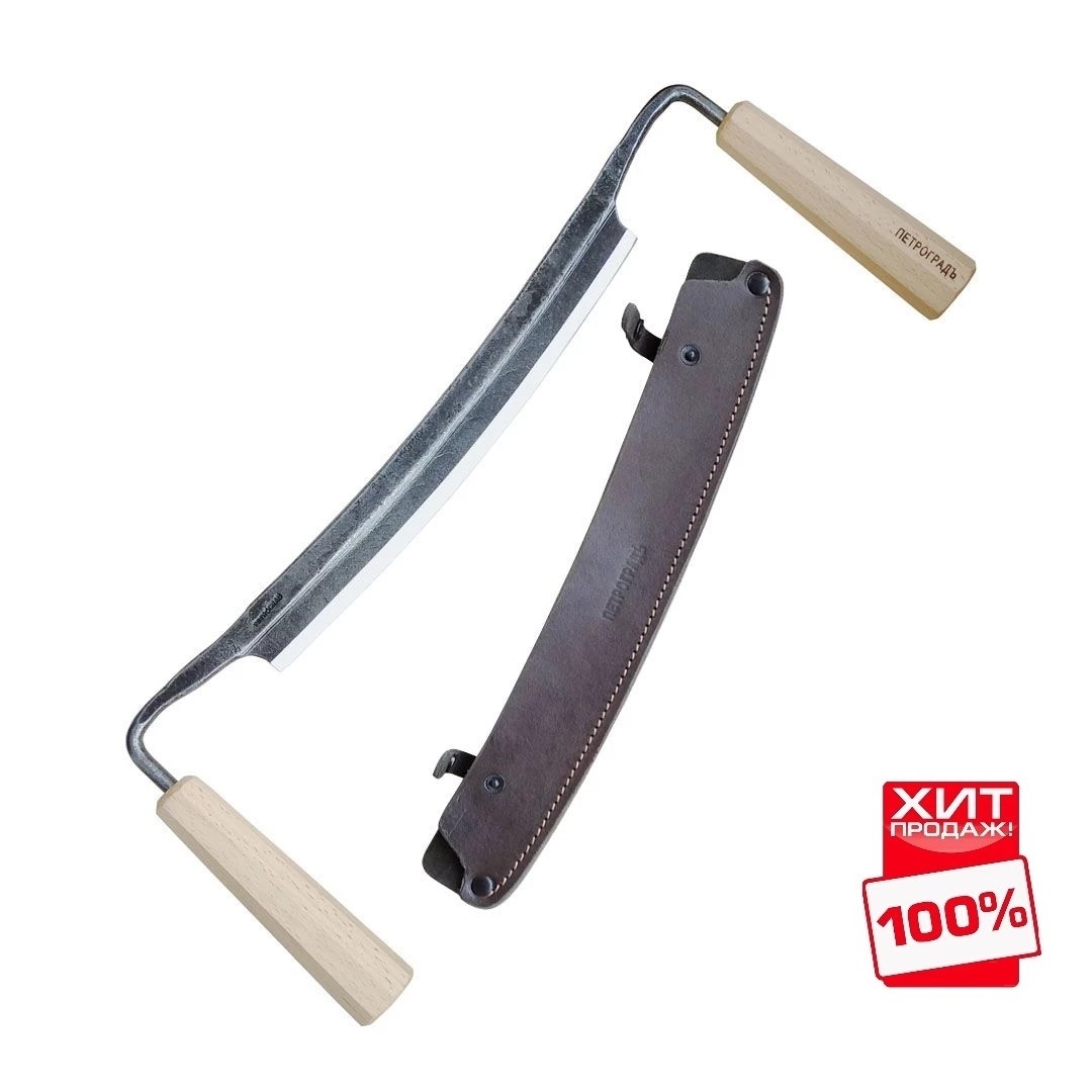 Рукояти слегка приподняты над плоскостью лезвия и позволяют работать вплотную к обрабатываемой поверхности. Тело скобеля целиком отковано вручную из инструментальной стали 9XC и закалено до 55...58 HRC. Радиус изгиба лезвия в обоих плоскостях составляет 1100 мм. Заточка режущей кромки выполнена под углом 30 градусов. На рабочей части лезвия сделана ступенька для уменьшения толщины режущей кромки. Чтобы уменьшить сопротивление при строгании и для удобства заточки. Фаска РК направлена вниз. Рукояти длиной 140 мм выполнены из бука, покрыты маслом.