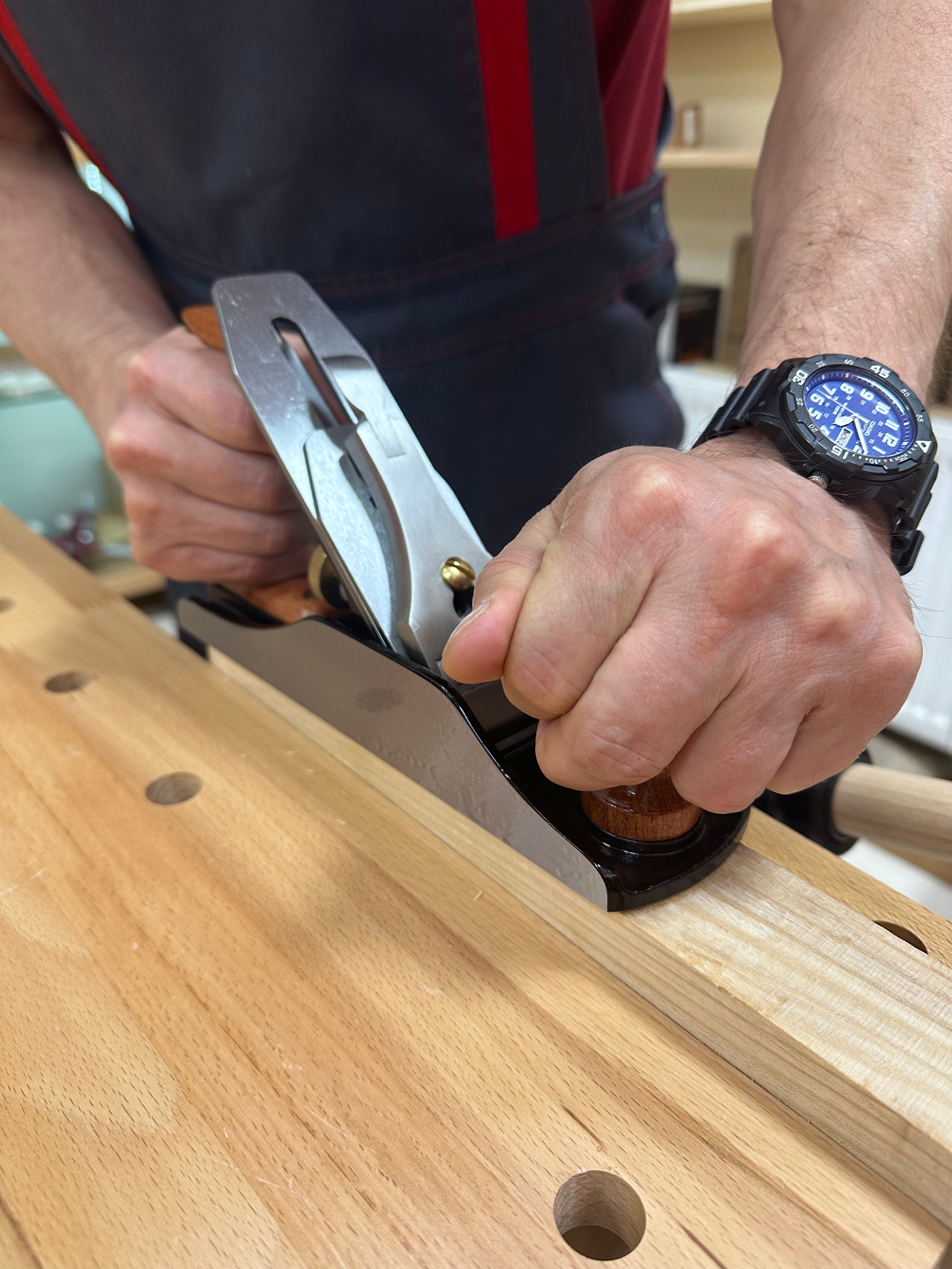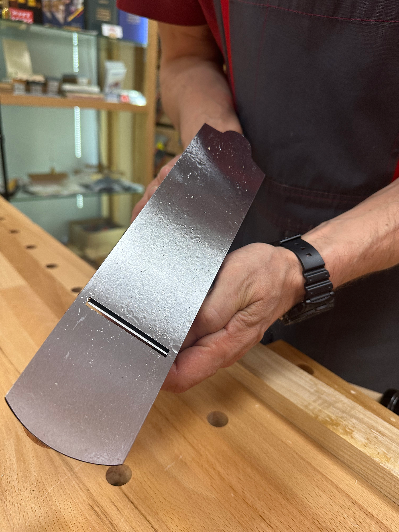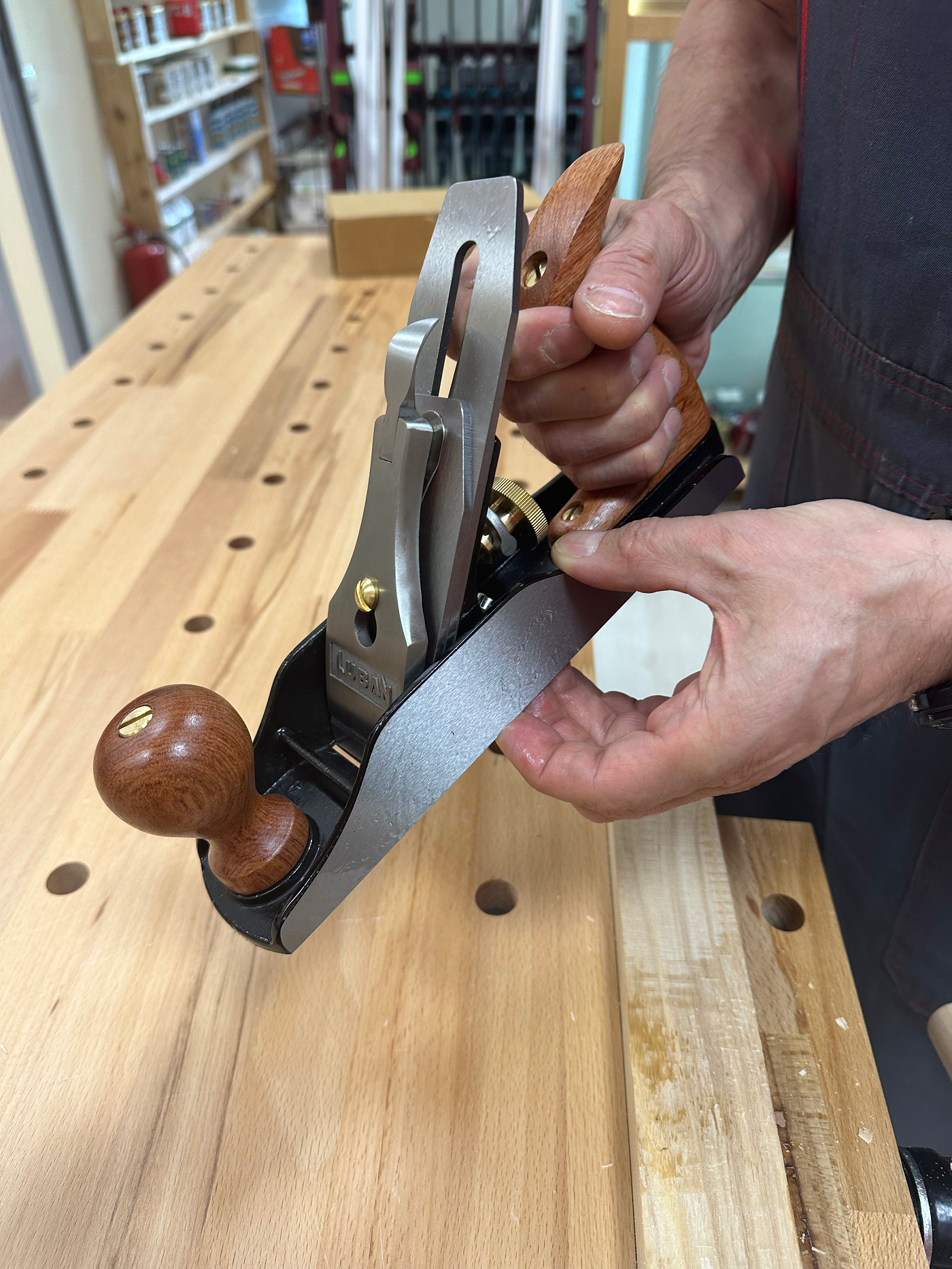Режущая кромка заточена, но требует доведения на абразивах от 3000 и выше на угол не менее 30 градусов. При работе по твердым породам древесины рекомендуемый угол заточки ножа от 35-37 градусов для более стойкой РК. Также конструкция рубанка позволяет устанавливать ножи премиум класса, такие как Veritas и Stenley. Угол установки ножа 45 градусов. Рубанок оснащен механизмом регулировки лягушки, благодаря чему можно изменять ширину ротка без изменения настроек ножа. Также снабжен механизмом плавной регулировки вылета ножа. Массивные рукояти из бука удобны в работе даже для людей с большими руками. Винты и гайки выполнены из латуни.