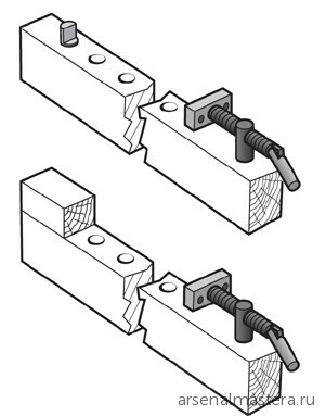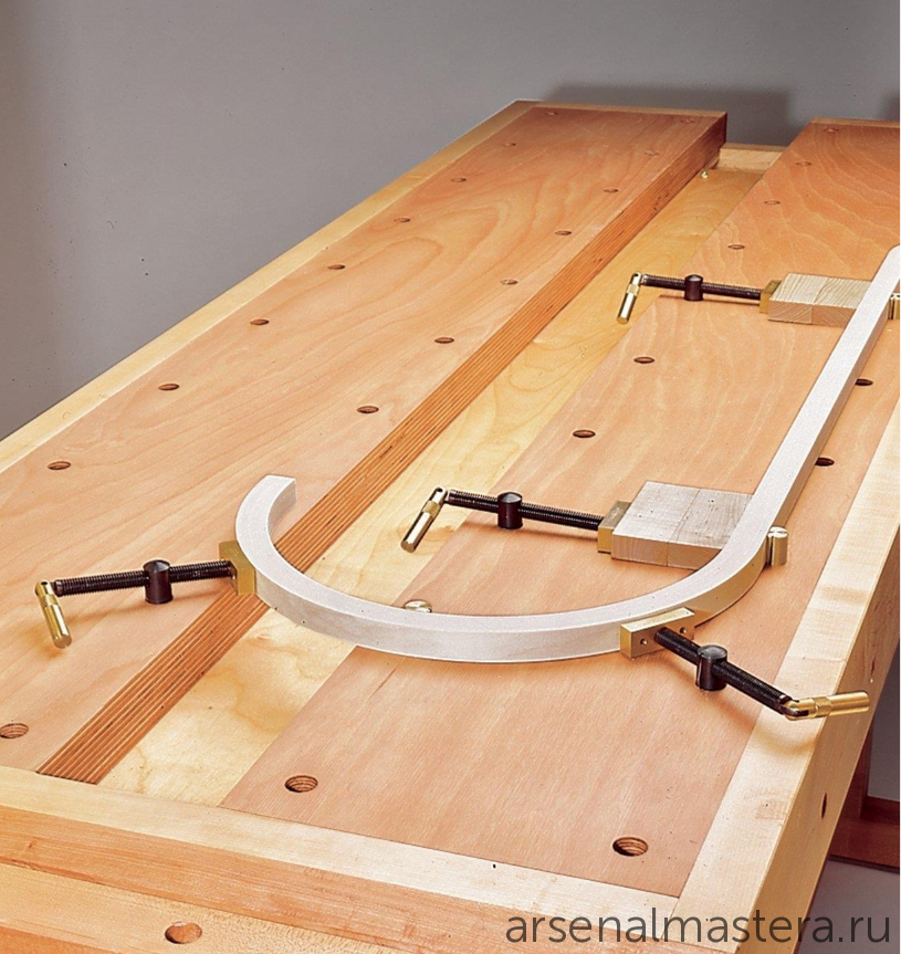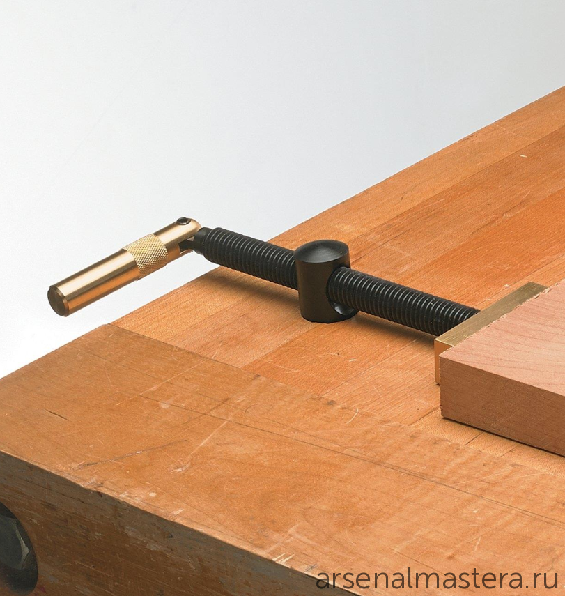 Этот упор с поджимом может использоваться везде, где можно просверлить отверстие 3/4 дюйма (1 дюйм = 25,4 мм). Позволяет зажимать изогнутые детали и детали неправильной формы. Для этого в губке имеются два отверстия для того, чтобы прикрутить накладку любой формы. Используя стандартный верстачный упор можно зажимать заготовки без ограничения по длине.
