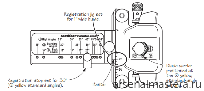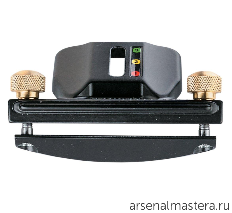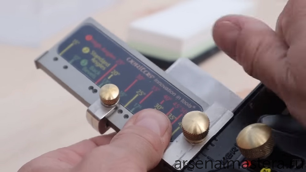 Информативный шаблон легко крепится винтом в паз, быстро снимается. По шаблону лезвие четко и жестко ставится под угол 90` (продольный) и нужный угол заточки. Эксцентриковым механизмом устанавливается необходимая величина микрофаски