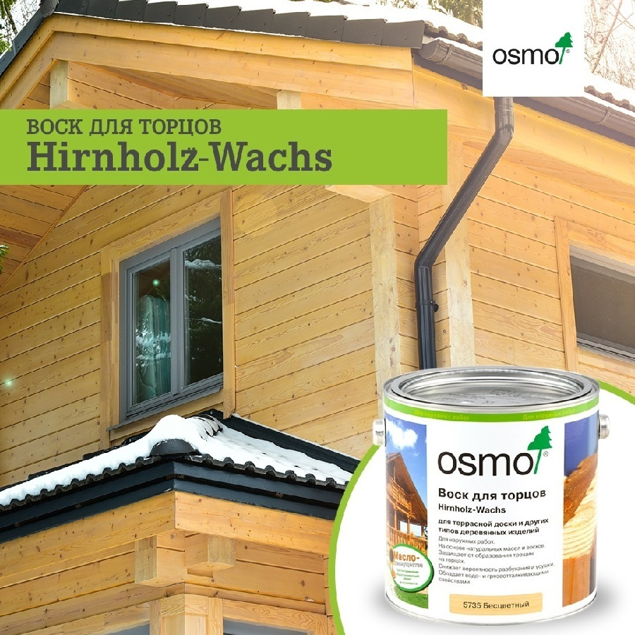 Наносить только на торцы. Не использовать для обработки плоских поверхностей. Излишки воска с других поверхностей удалить ветошью. Масла усиливают естественный цвет древесины (эффект «влажной поверхности»). После высыхания торцов покрыть оставшиеся поверхности краской OSMO, например, маслом для бангкирай Bangkirai-Öl и т.д., или непрозрачной краской для наружных работ OSMO Landhausfarbe, или защитным маслом-лазурью для древесины OSMO Holzschutz Öl-Lasur.