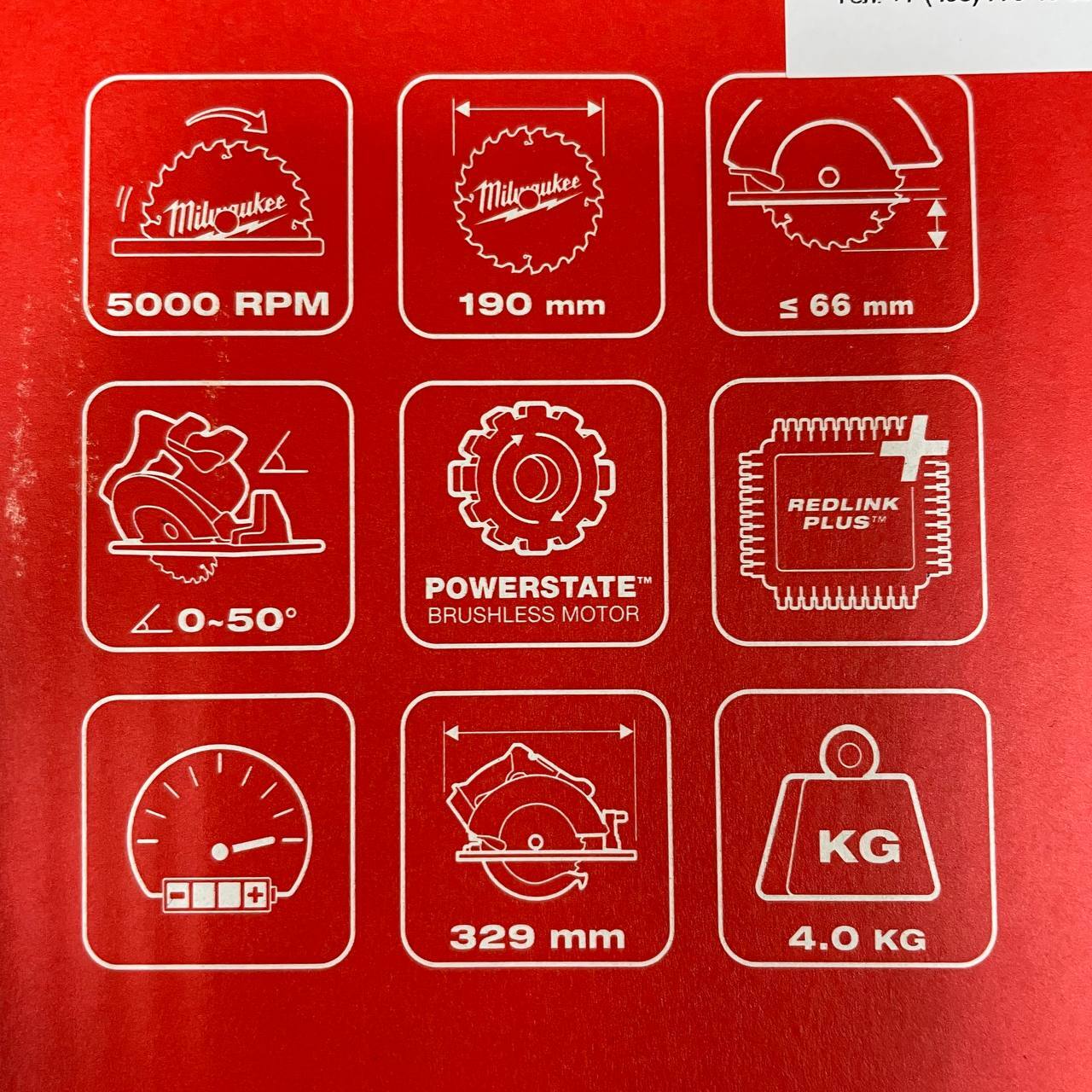 Бесщёточный двигатель; скорость 5000 об/мин; диск 190х30 мм; макс. глубина пропила 66 мм; 2 аккумулятора; з/у; вес 4 кг; HD кейс