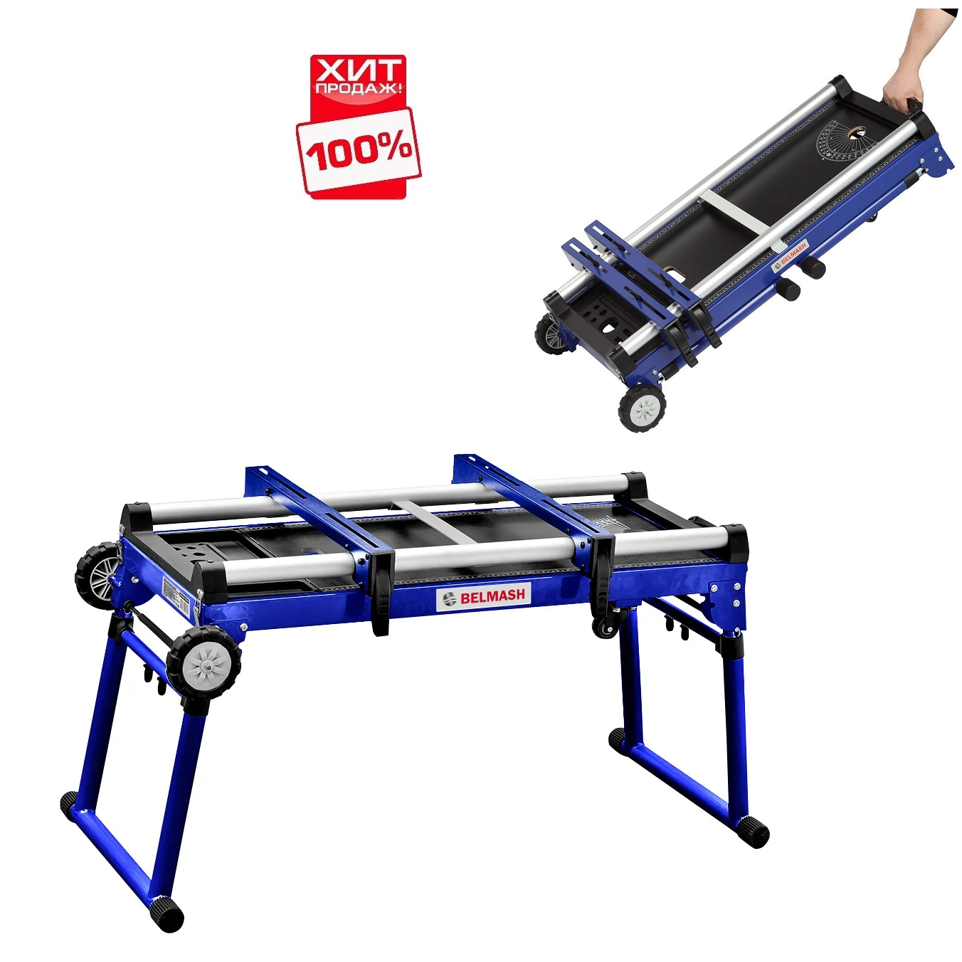 В сложенном виде верстак превращается в удобную тележку для перевозки инструментов, подкатную платформу (ползун).