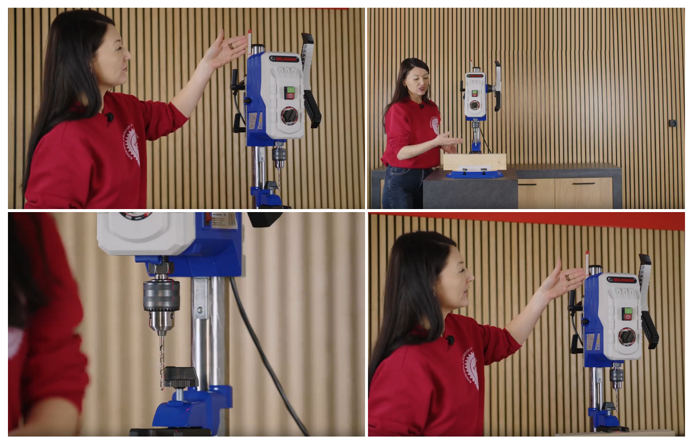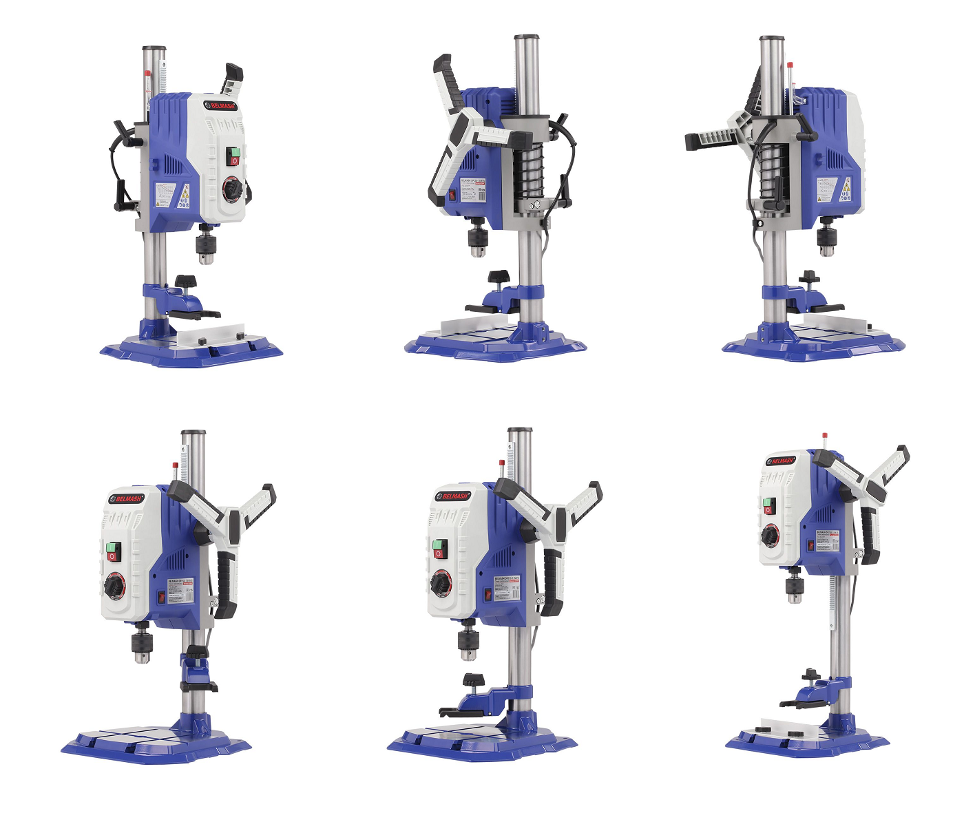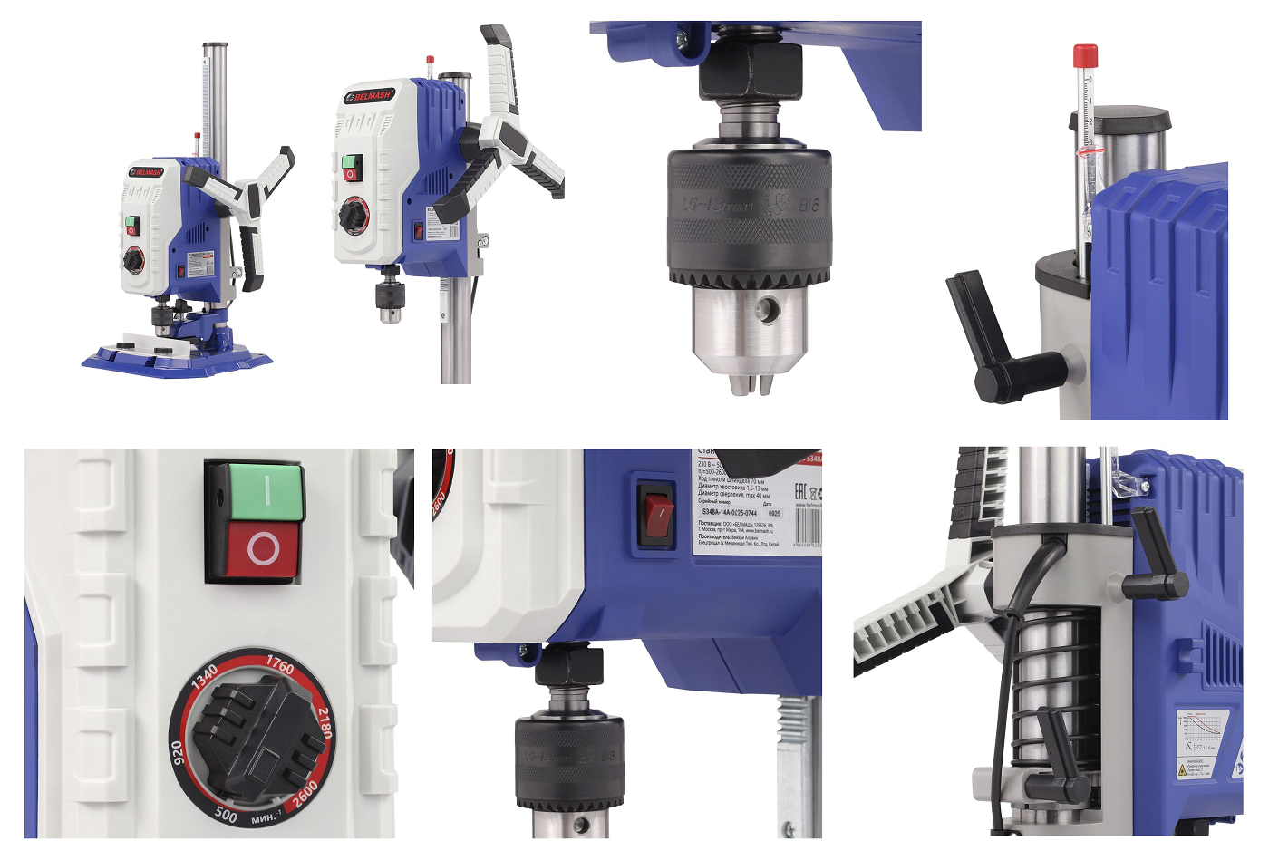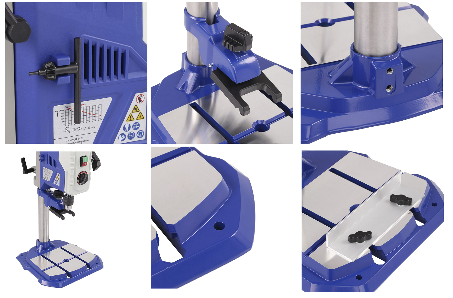 Все элементы управления расположены удобно. Рукоятка подачи обеспечит плавное заглубление сверла. Держатель для ключа на корпусе исключит его потерю. Небольшой вес облегчит перемещение станка, жесткая конструкция обеспечит устойчивость при сверлении.
