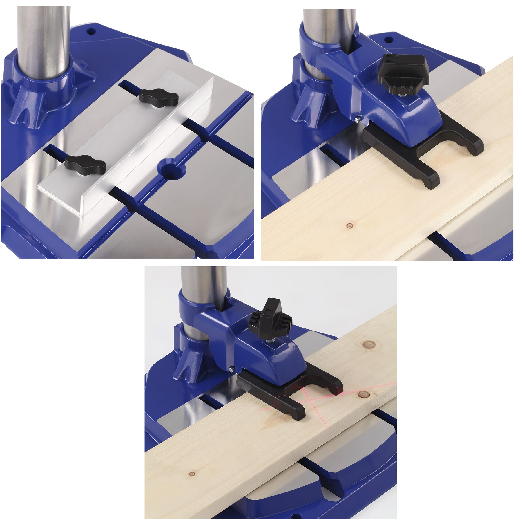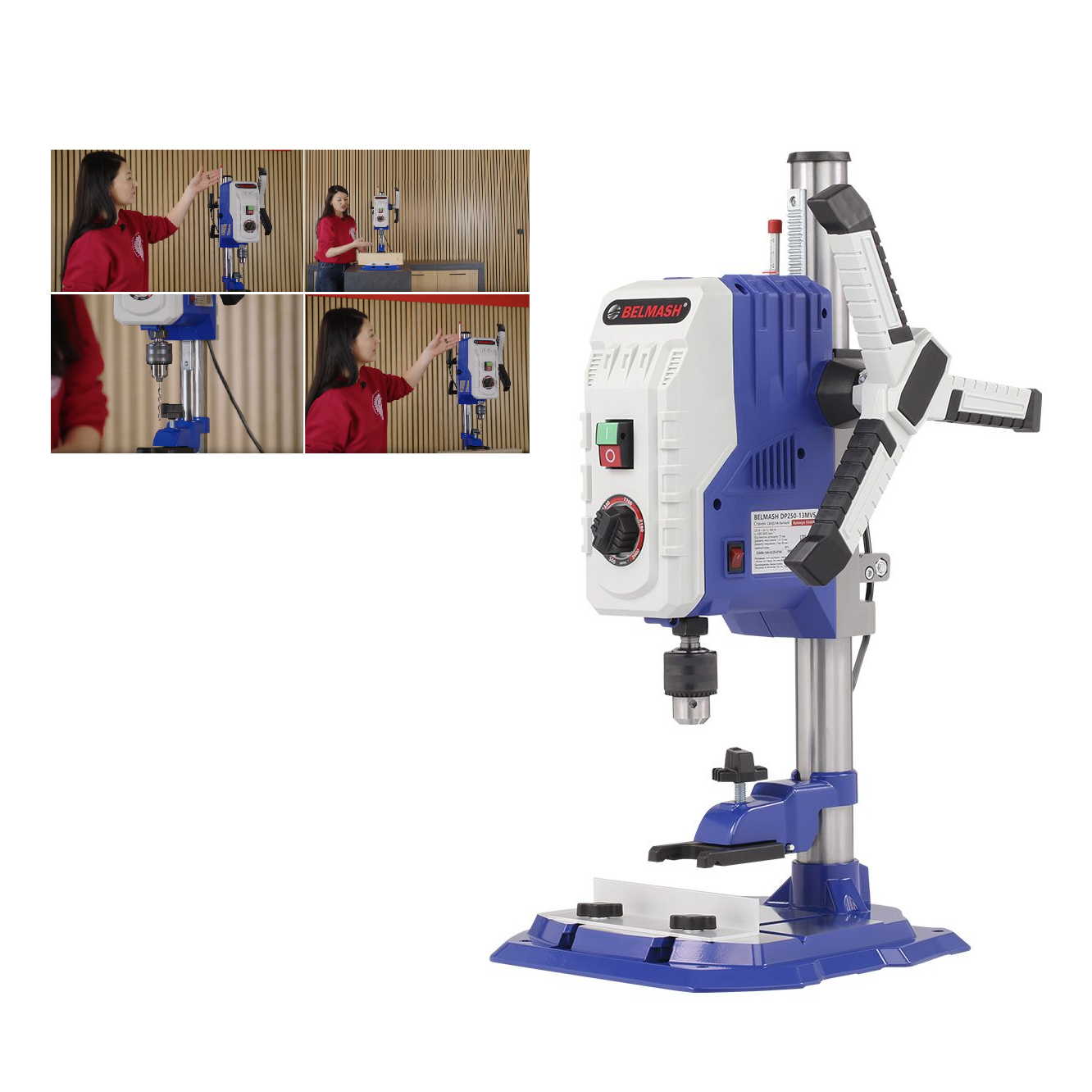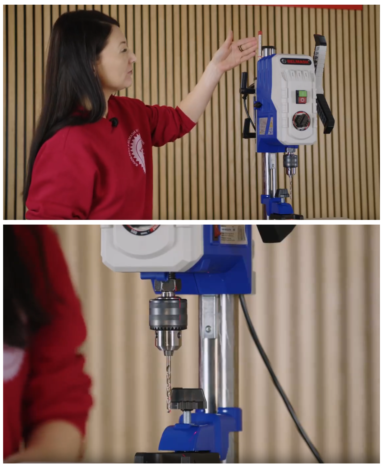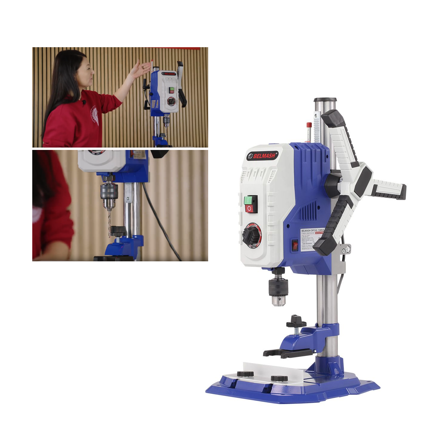 Все элементы управления расположены удобно. Рукоятка подачи обеспечит плавное заглубление сверла. Держатель для ключа на корпусе исключит его потерю. Небольшой вес облегчит перемещение станка, жесткая конструкция обеспечит устойчивость при сверлении.