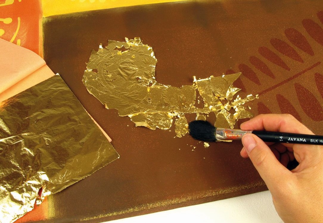 Наклеить золотой лист, прижимая лист мягкой кистью.