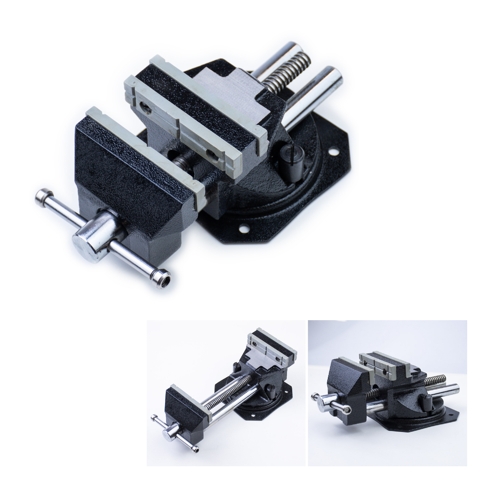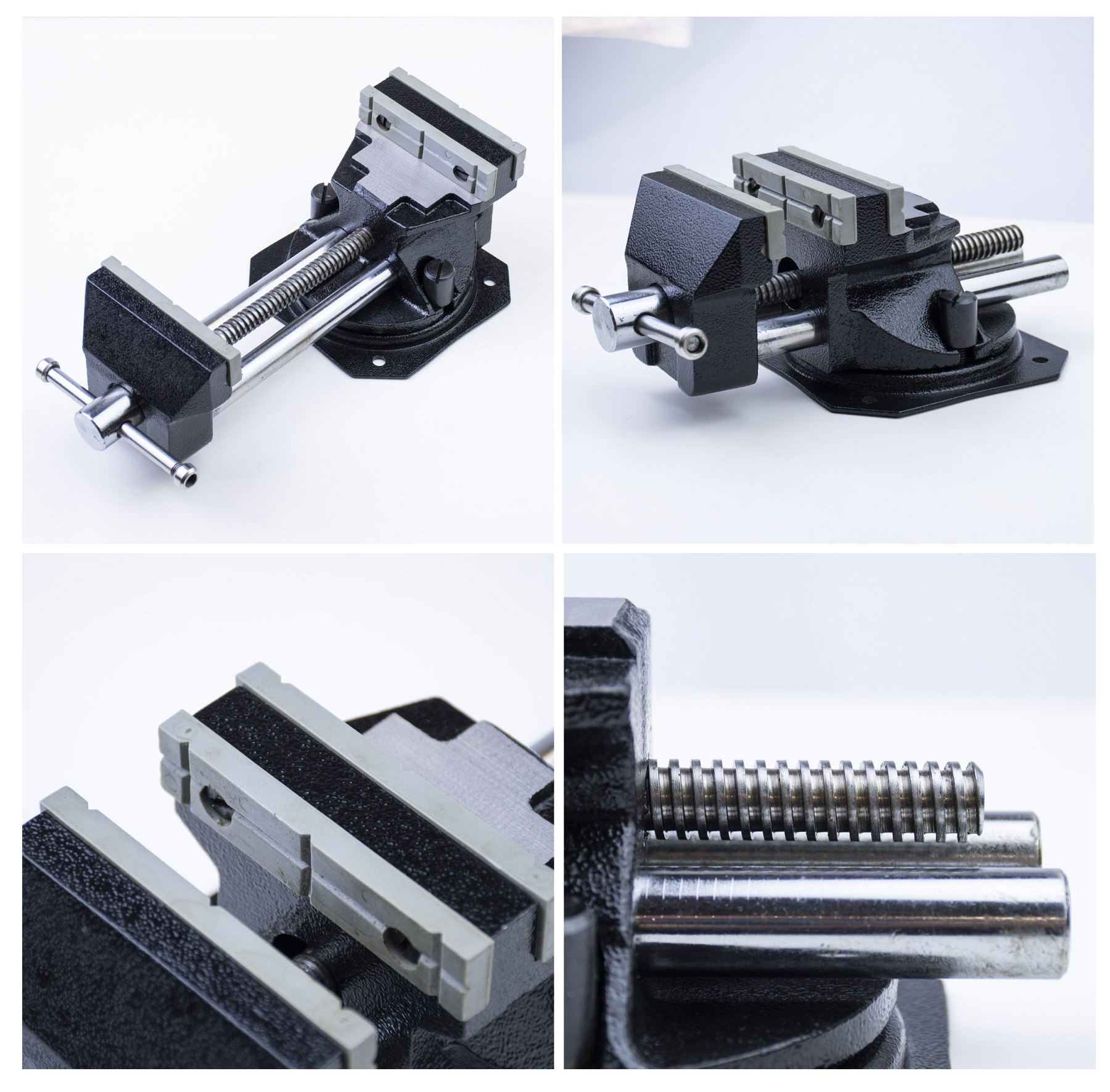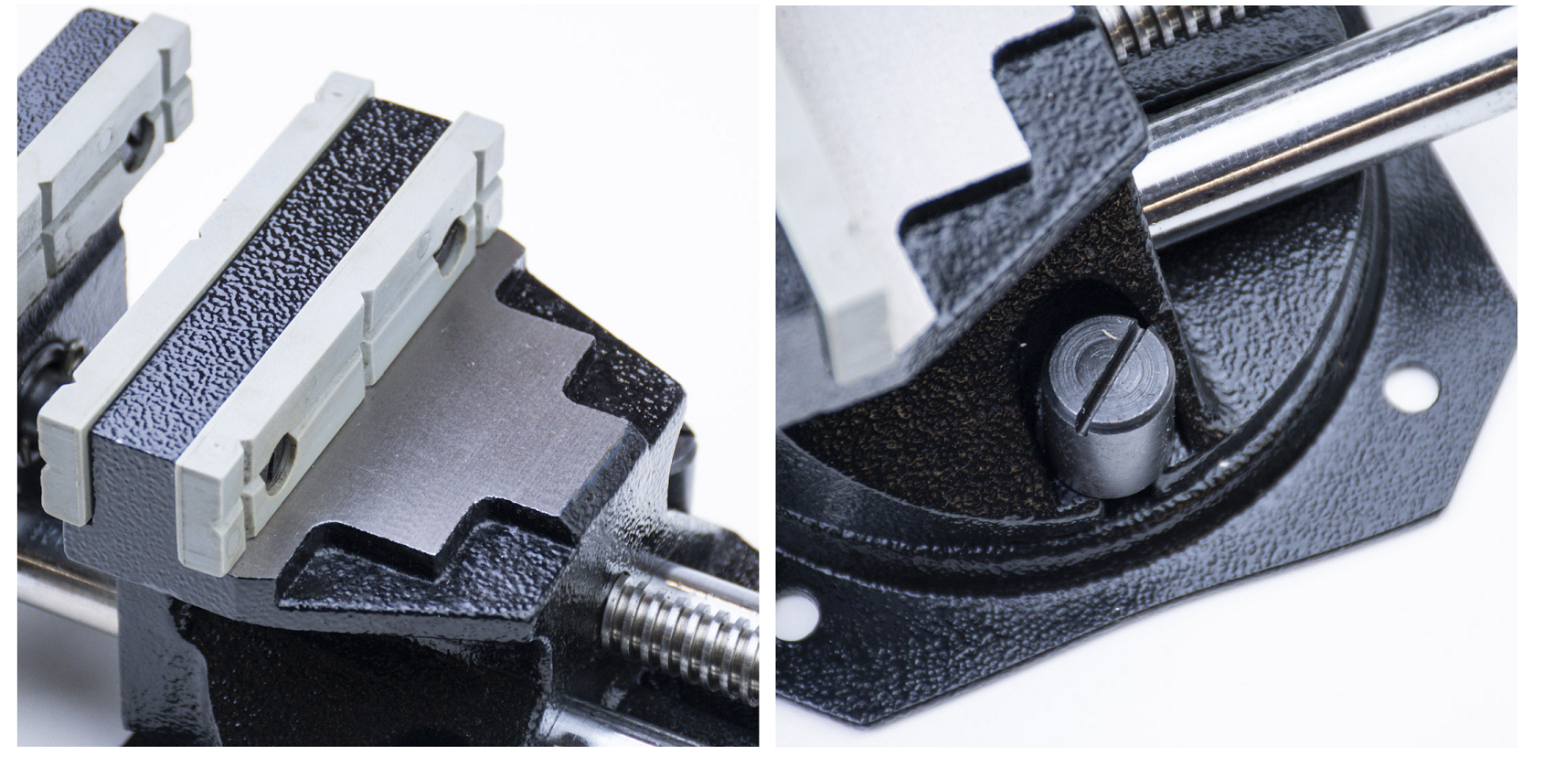 - Выполнены из чугуна, оснащены пластиковыми накладками на губках, имеется поворотный механизм.