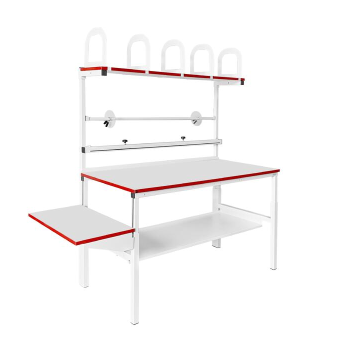 Функциональное расширение комплекта стола для упаковки КСР возможно с помощью доп. оснащения, начиная от типов покрытий столешницы, ограничителей, доп. держателей для рулонов (ДРВ, ДРБ), ящиков, заканчивая комплектом светодиодного освещения КОС.