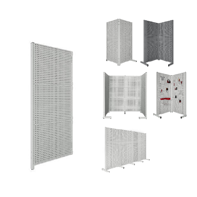 Основа системы — несущие стойки и перфорированные панели из прочной стали с износостойким порошковым покрытием, устойчивым к коррозии, механическим нагрузкам. Благодаря унифицированному шагу перфорации панели совместимы со стандартными держателями, навесным оборудованием.