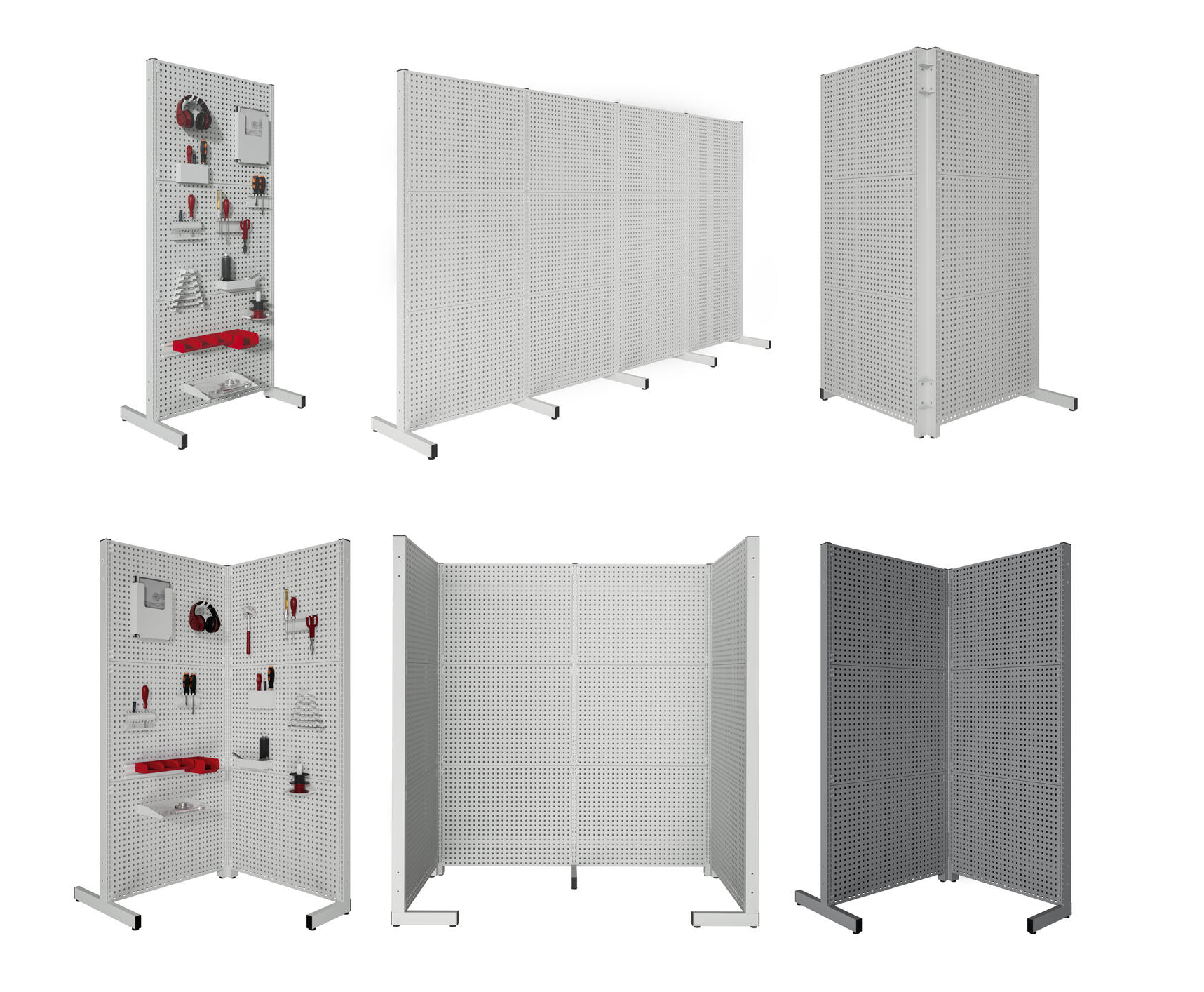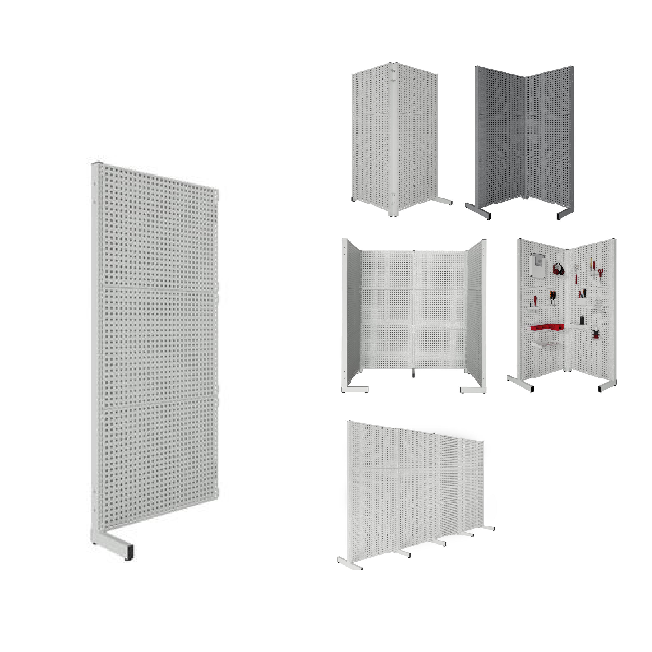 Основа системы — несущие стойки и перфорированные панели из прочной стали с износостойким порошковым покрытием, устойчивым к коррозии, механическим нагрузкам. Благодаря унифицированному шагу перфорации панели совместимы со стандартными держателями, навесным оборудованием.