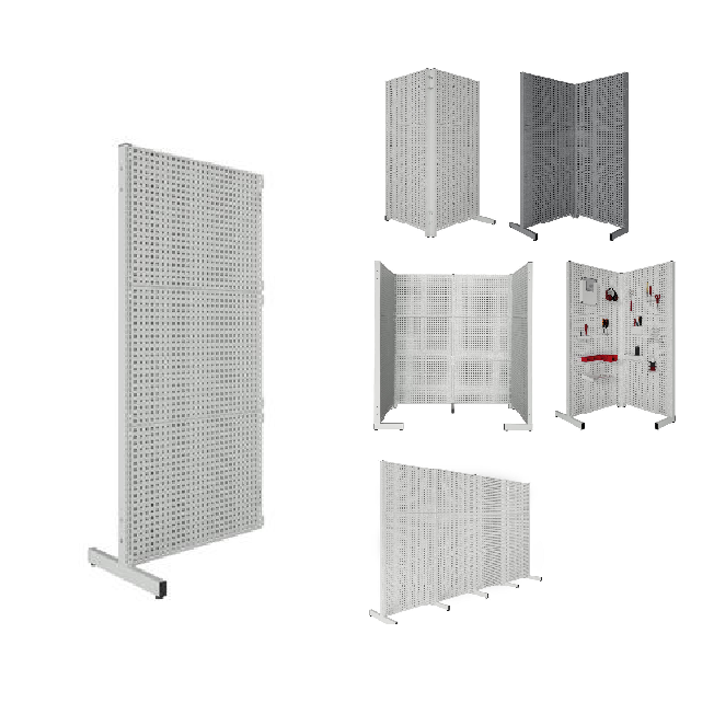 Основа системы — несущие стойки и перфорированные панели из прочной стали с износостойким порошковым покрытием, устойчивым к коррозии, механическим нагрузкам. Благодаря унифицированному шагу перфорации панели совместимы со стандартными держателями, навесным оборудованием.