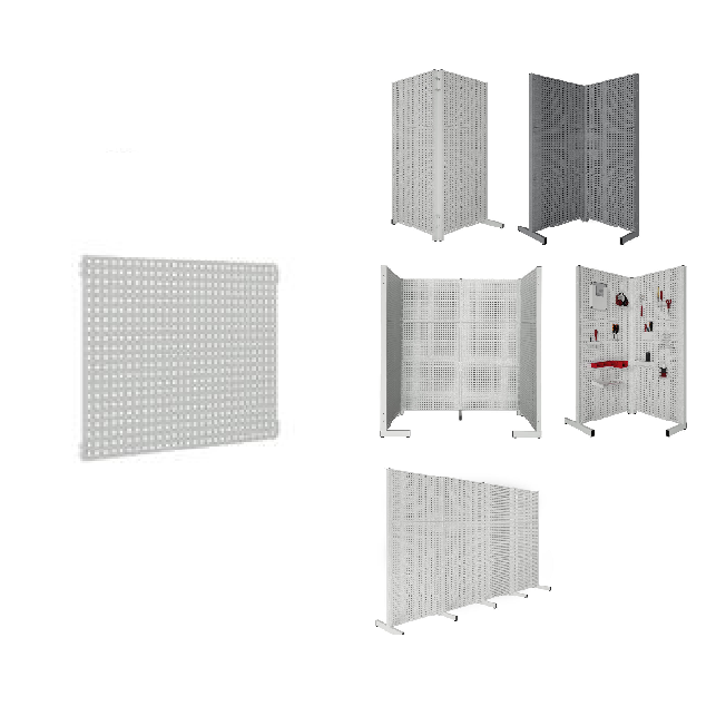 Основа системы — несущие стойки и перфорированные панели из прочной стали с износостойким порошковым покрытием, устойчивым к коррозии, механическим нагрузкам. Благодаря унифицированному шагу перфорации панели совместимы со стандартными держателями, навесным оборудованием.
