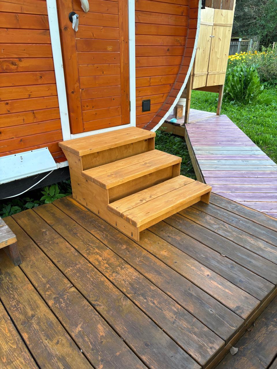 Цвет получается разным, но это и понятно: по старой доске цвет более темный, но близкий к тому, что было ранее после нанесения бесцветного террасного масла от V3V (V33) - это грязно-желтый, охристый цвет. Неплохой, кстати. Я не жалею, что выбрал этот цвет. Но на доске, ранее обработанной очистителем, масло сохнет как минимум пару дней. Хорошо видно потом, как оно отталкивает воду. На необработанной древесине цвет сочный желтый с сохранением структуры дерева. Привожу фото, где видно и цвет террасы и цвет лесенки. На необработанной древесине краска сохнет 24 часа, как написано. Также краска пахнет. Особый запах - он не едкий, непротивный, но какой-то земляной что-ли... Не могу описать.