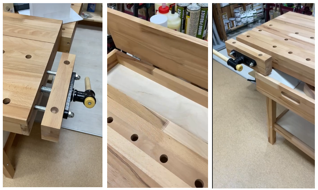 Столешница изготовлена из мебельного клееного щита. Основание и тиски - из склеенных брусков.