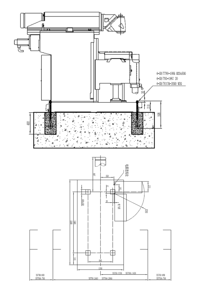 Фундамент должен располагаться на твердой почве. Поставьте станок на фундамент после того, как он полностью высохнет, затем закрепите болтами к бетону, тщательно отрегулируйте, убедитесь, что его выравнивание не превышает допустимые пределы 0.04/1000 мм в поперечном и продольном направлениях после затягивания болтов.