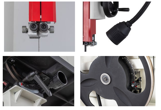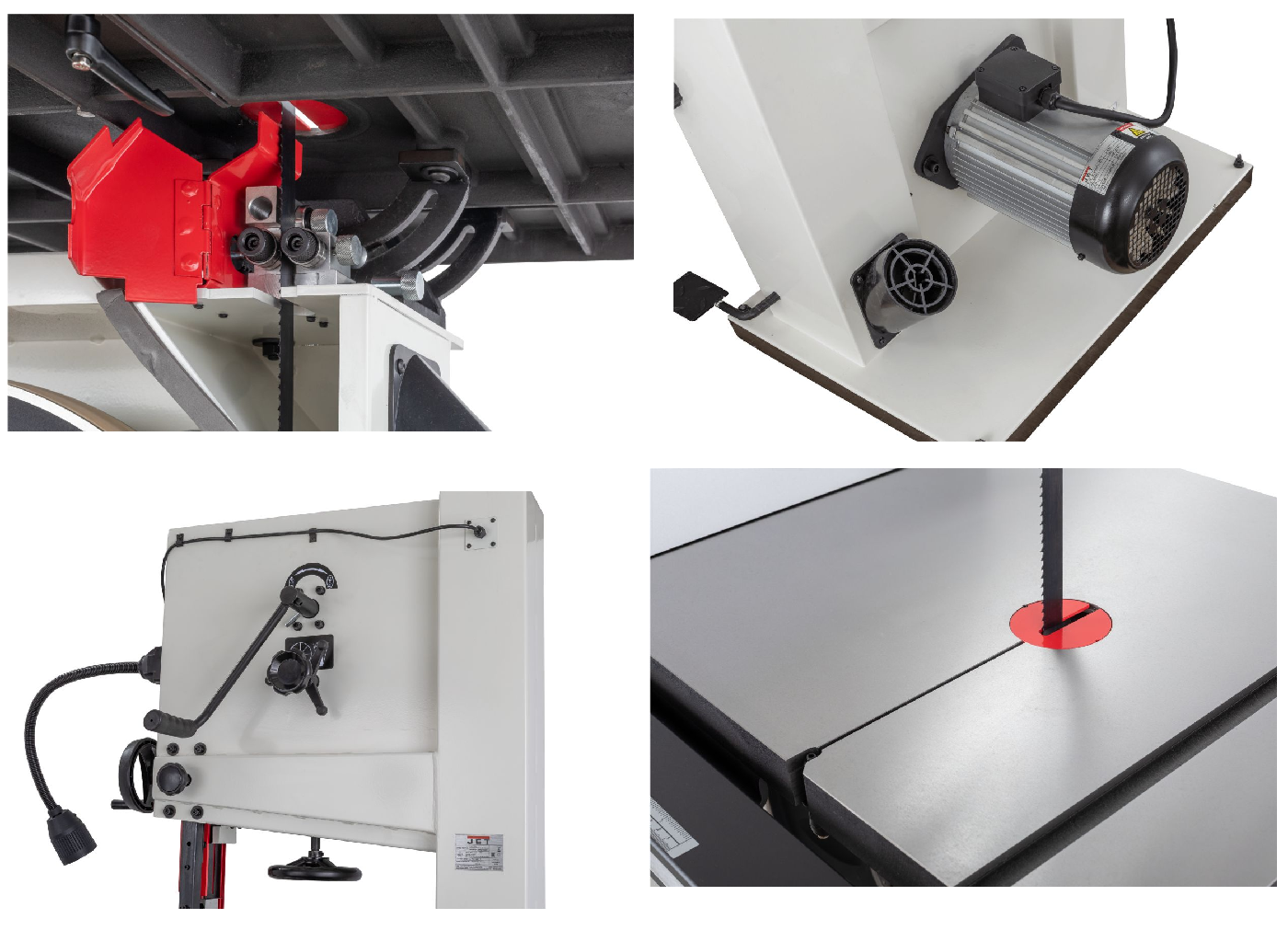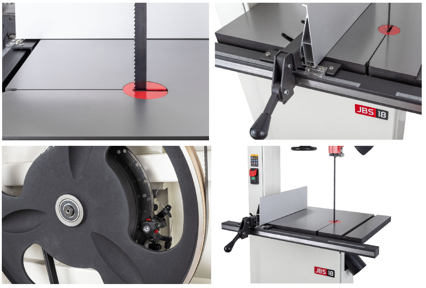 Мощная сварная рама, большой чугунный, высокоточный рабочий стол, чугунные приводные шкивы компьютерной балансировки, возможность установки пильных полотен шириной до 32 мм. Система тормозов мгновенной, аварийной остановки пиления, быстрое ослабление пильного полотна для его замены.