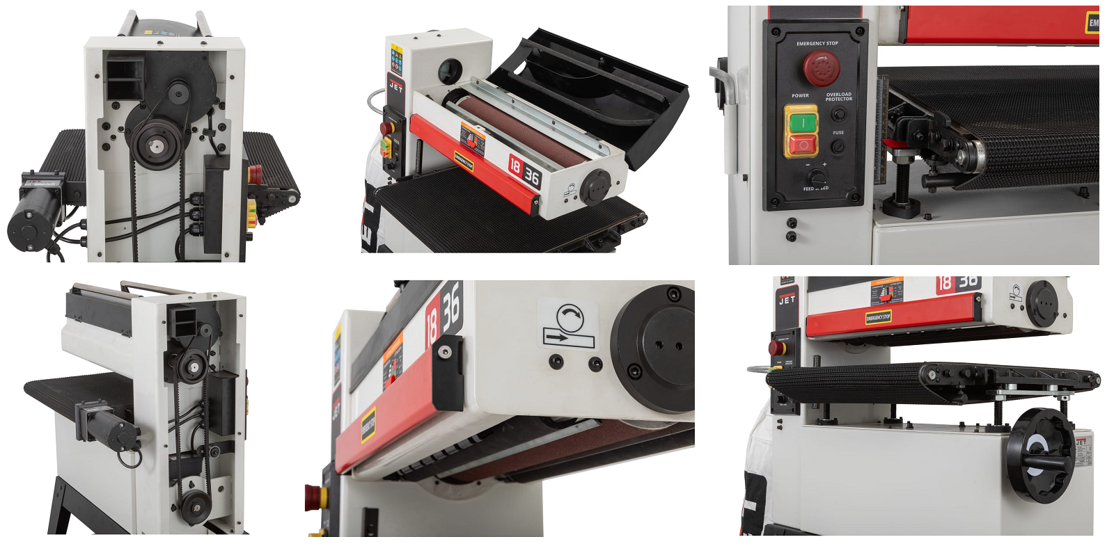 Подача заготовок на высоком профессиональном уровне. Прижимные, подающий и принимающий ролики. Увеличенный их диаметр по сравнению с предыдущими моделями JET. Ролики с резиновым покрытием, уверенное продвижение заготовок через зону шлифования. Они подпружинены.