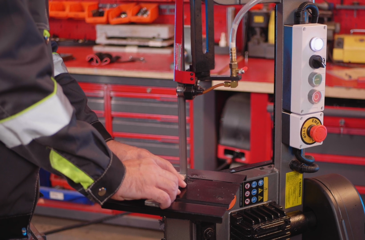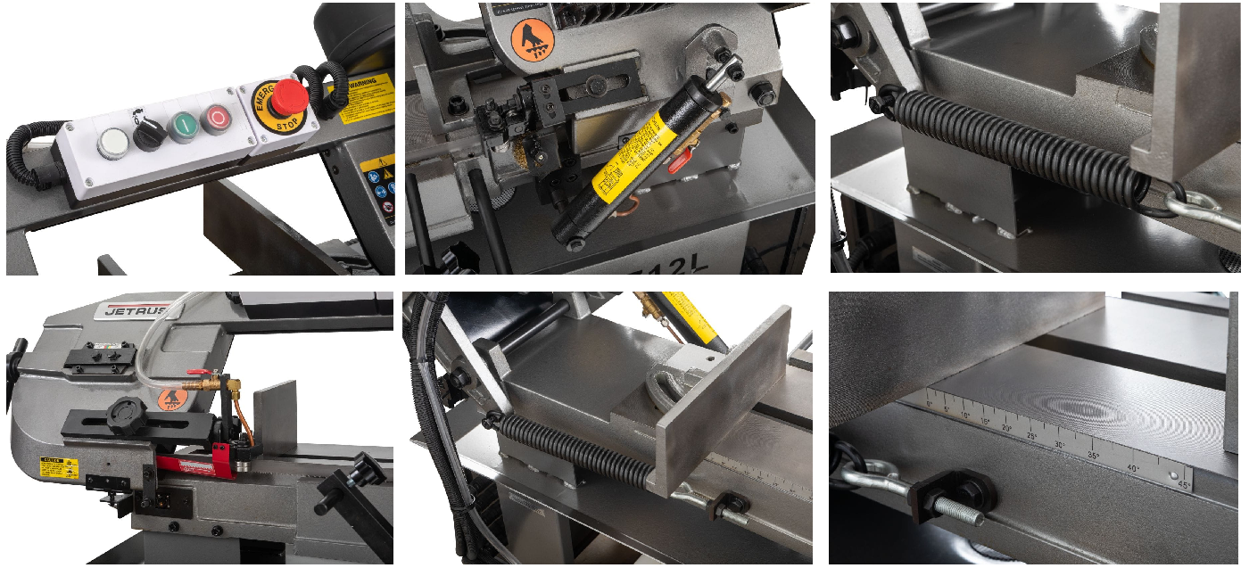 Кнопка аварийной остановки двигателя, имеет тензометр, с помощью которого можно регулировать силу натяжения ленточной пилы.