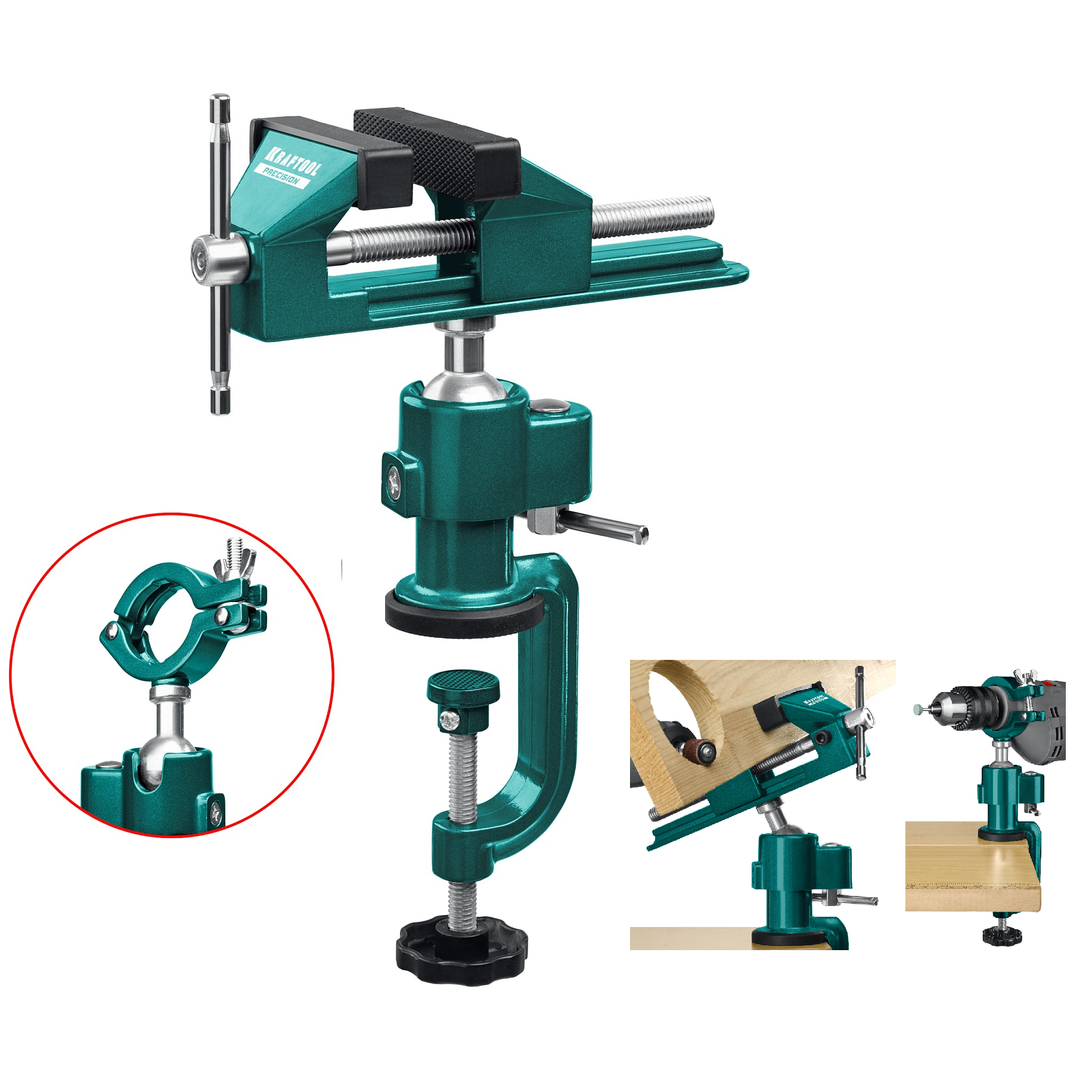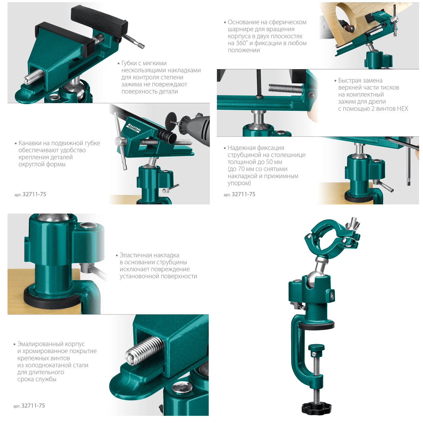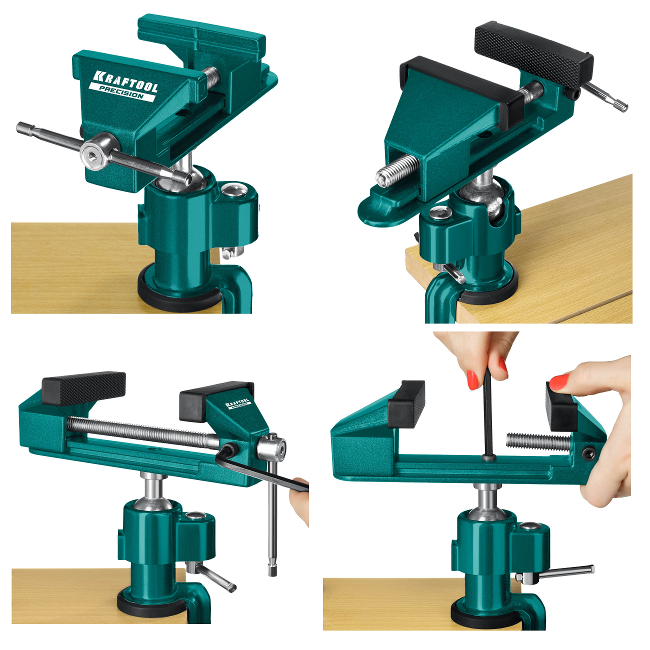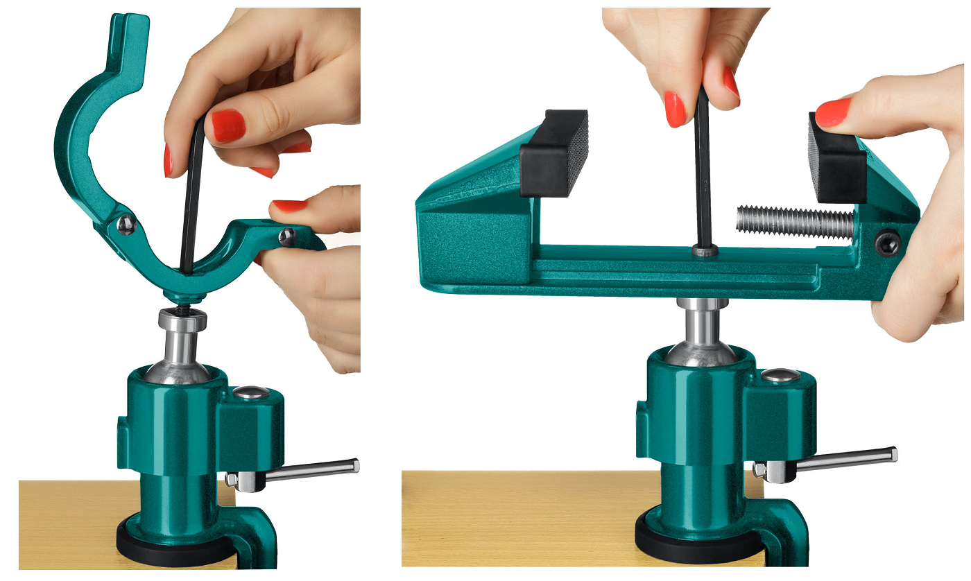 - Быстрая, надежная установка тисков на столе осуществляется с помощью струбцины.
