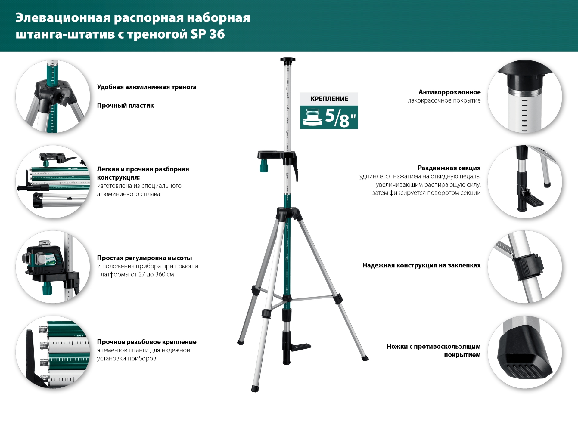 В качестве основного крепёжного элемента при установке лазерных нивелиров, оптической, измерительной, фототехники.