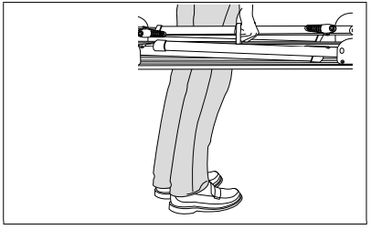 Расположите стол на ровной поверхности опорами вверх. Нажмите на фиксирующий рычаг и поверните опору до щелчка фиксатора. Убедитесь в надежной фиксации ножек. Переверните стол и убедитесь в устойчивости.