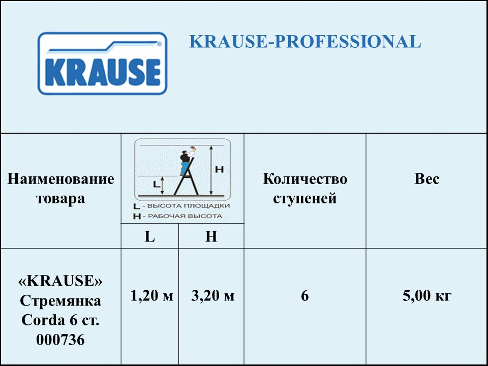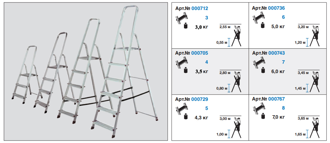 6-ти ступенчатая: рабочая высота 3,2 м, высота до рабочей платформы 1,2 м, вес 5 кг.