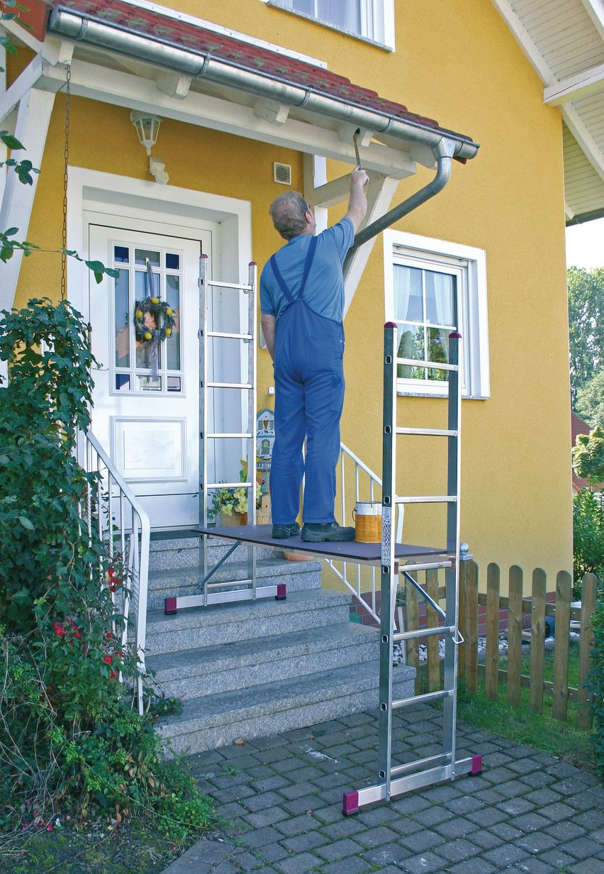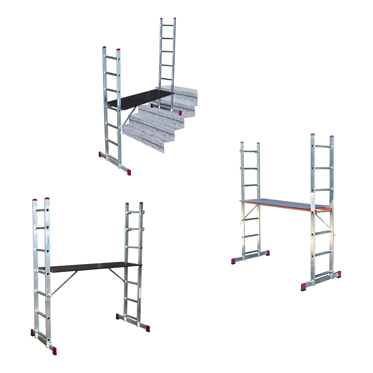 Состоят из двух приставных лестниц с широкими поперечными траверсами и рабочей платформой, которую можно установить на любой перекладине