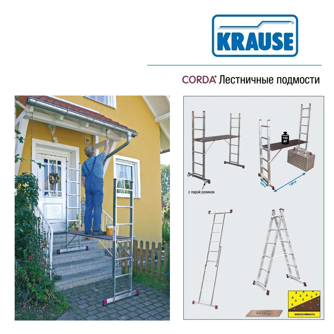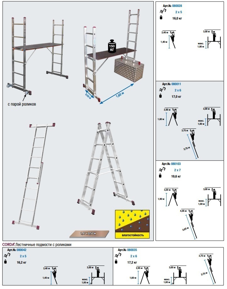 Компактные габариты в качестве подмостей 50х 1,60 см. Наличие рабочей платформы с водоотталкивающим покрытием с размерами 147х 50 см.