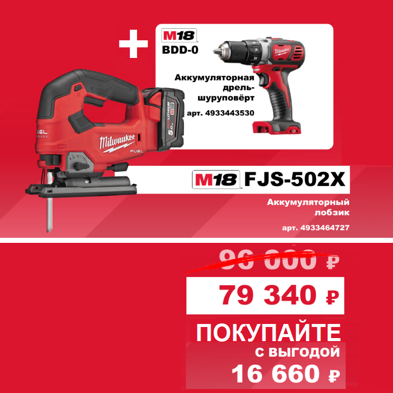 - 4933464727 M18 FJS-502X FUEL Аккумуляторный лобзик, Два аккумулятора M18 B5 5.0 Ач, Быстрое зарядное устройство M12-18 FC кейс Milwaukee