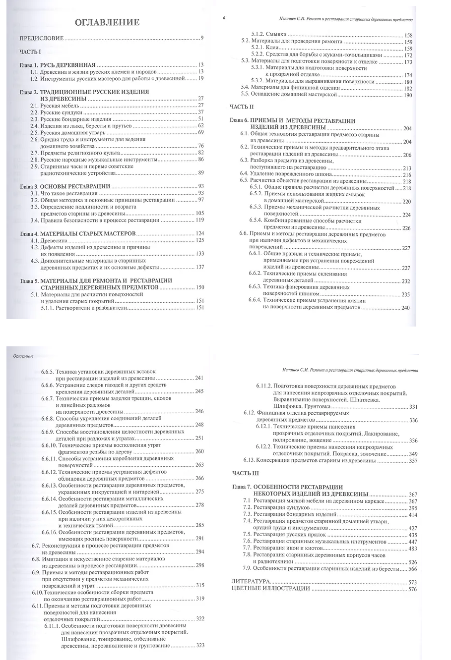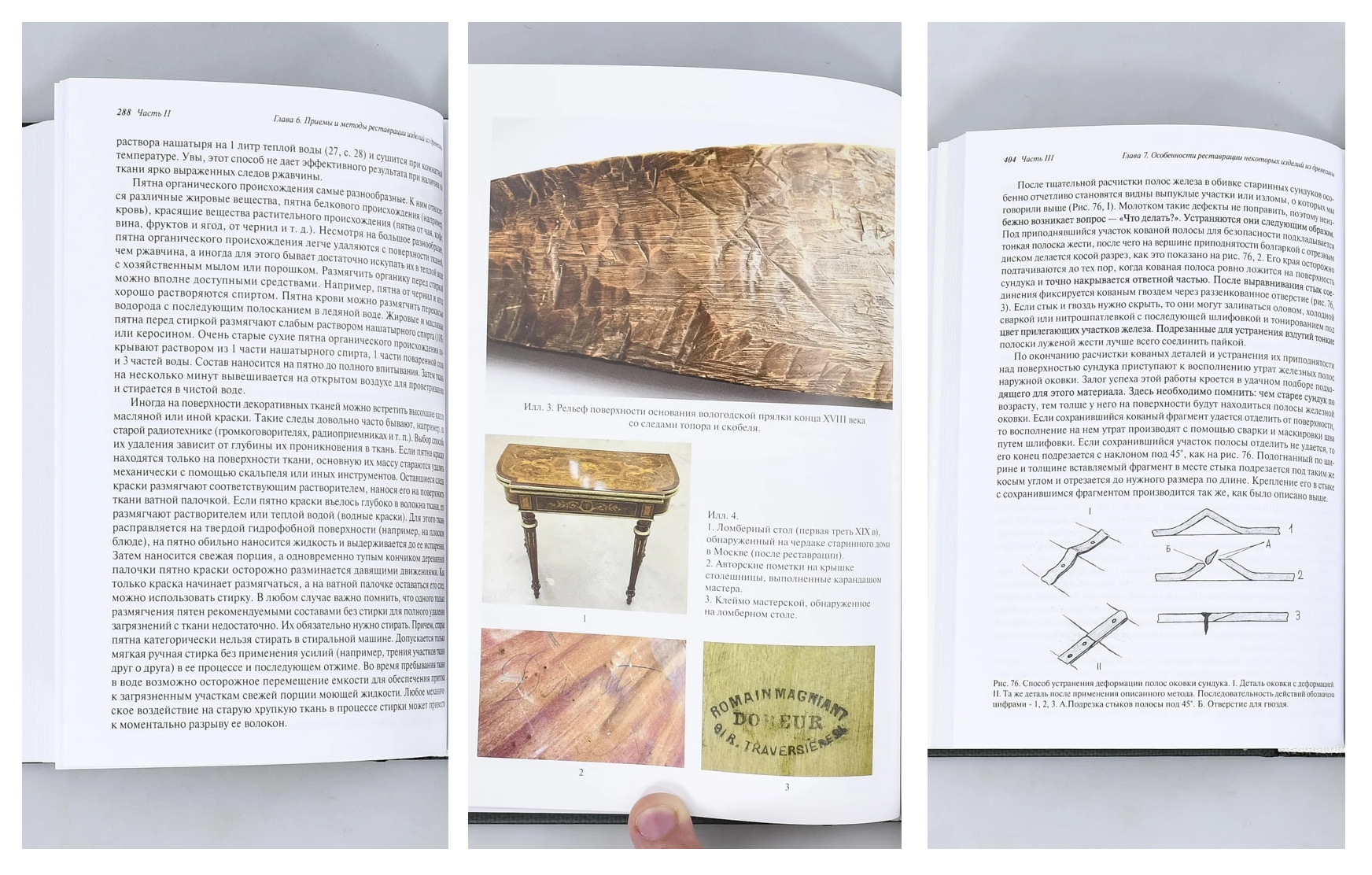 Автор профессиональный реставратор, кандидат наук. Он подробно описывает основные приемы и методы расчистки старинных предметов от загрязнений, реставрации лакокрасочных покрытий, устранения возрастных дефектов, механических повреждений, вмятин и трещин, восстановления целостности разломов, восполнения утрат, реконструкции недостающих фрагментов, имитации разных материалов, искусственного состаривания древесины, нанесения отделочных покрытий.