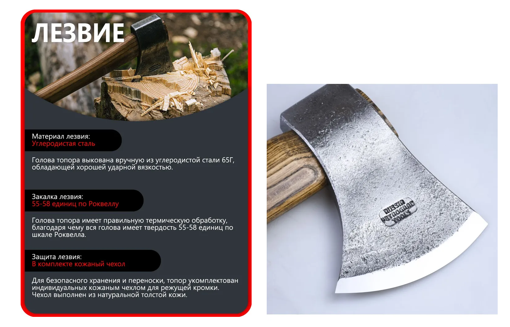 Индивидуальный подход к изготовлению каждого топора позволяет гарантировать его остроту, надежность.