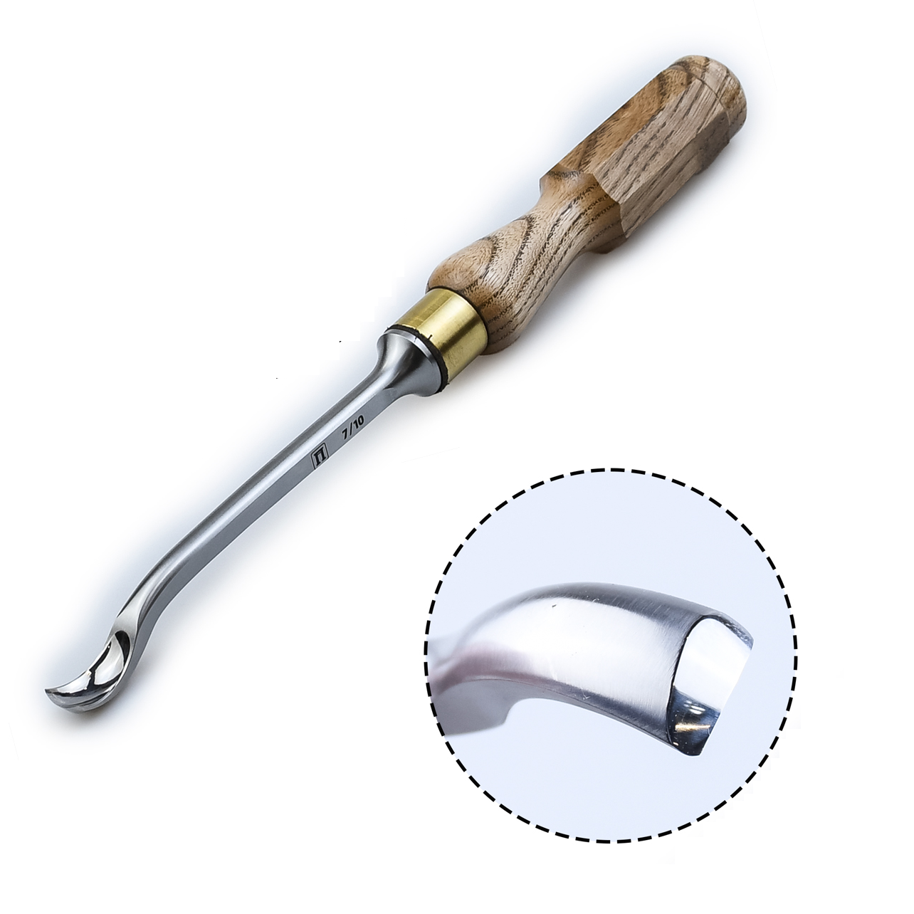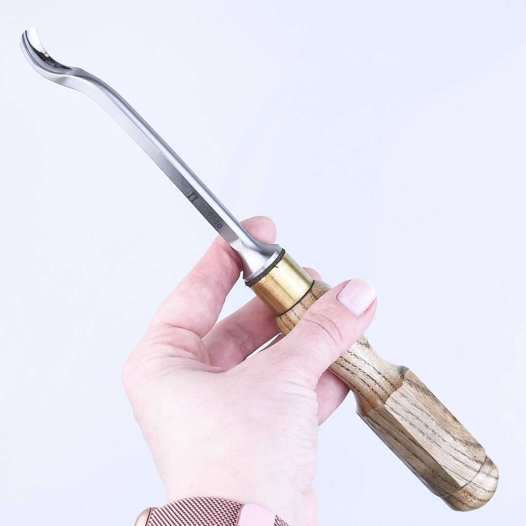Откована из низколегированной высокоуглеродистой стали. Закалена до твёрдости 59-61 HRc. Внутренний профиль стамески отполирован, режущая кромка заточена и готова к работе.