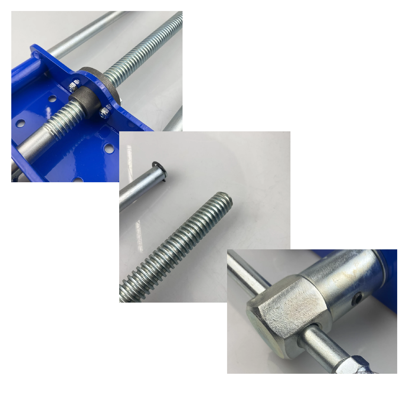 Открытый винт из высококачественной стали с трапецеидальной резьбой и 2 направляющих стержня. заключенные в стальной каркас и планку.