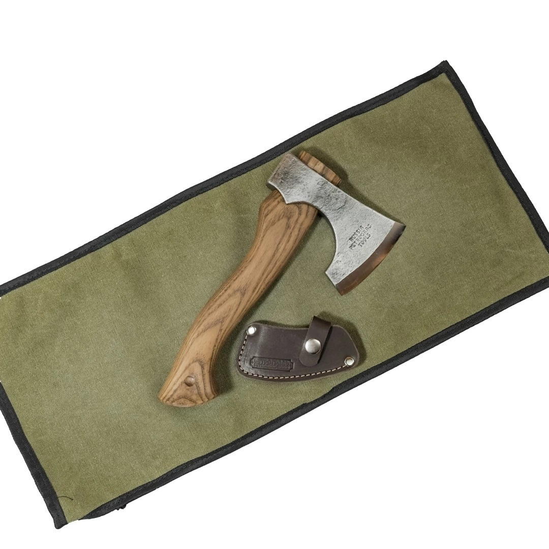 Выкованный вручную из инструментальной легированной стали и закаленный до 55-57 HRc, этот топор долго сохраняет остроту и привлекательный внешний вид, а прочный кожаный чехол на заклепках обеспечивает безопасную транспортировку.