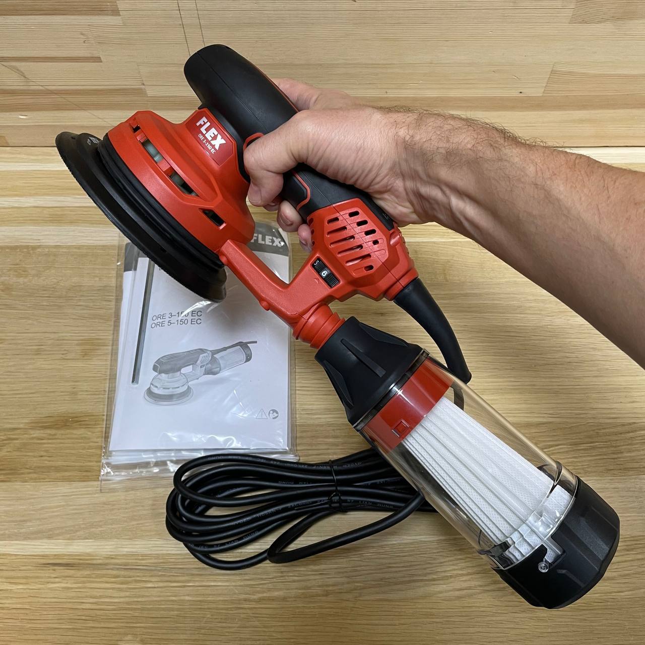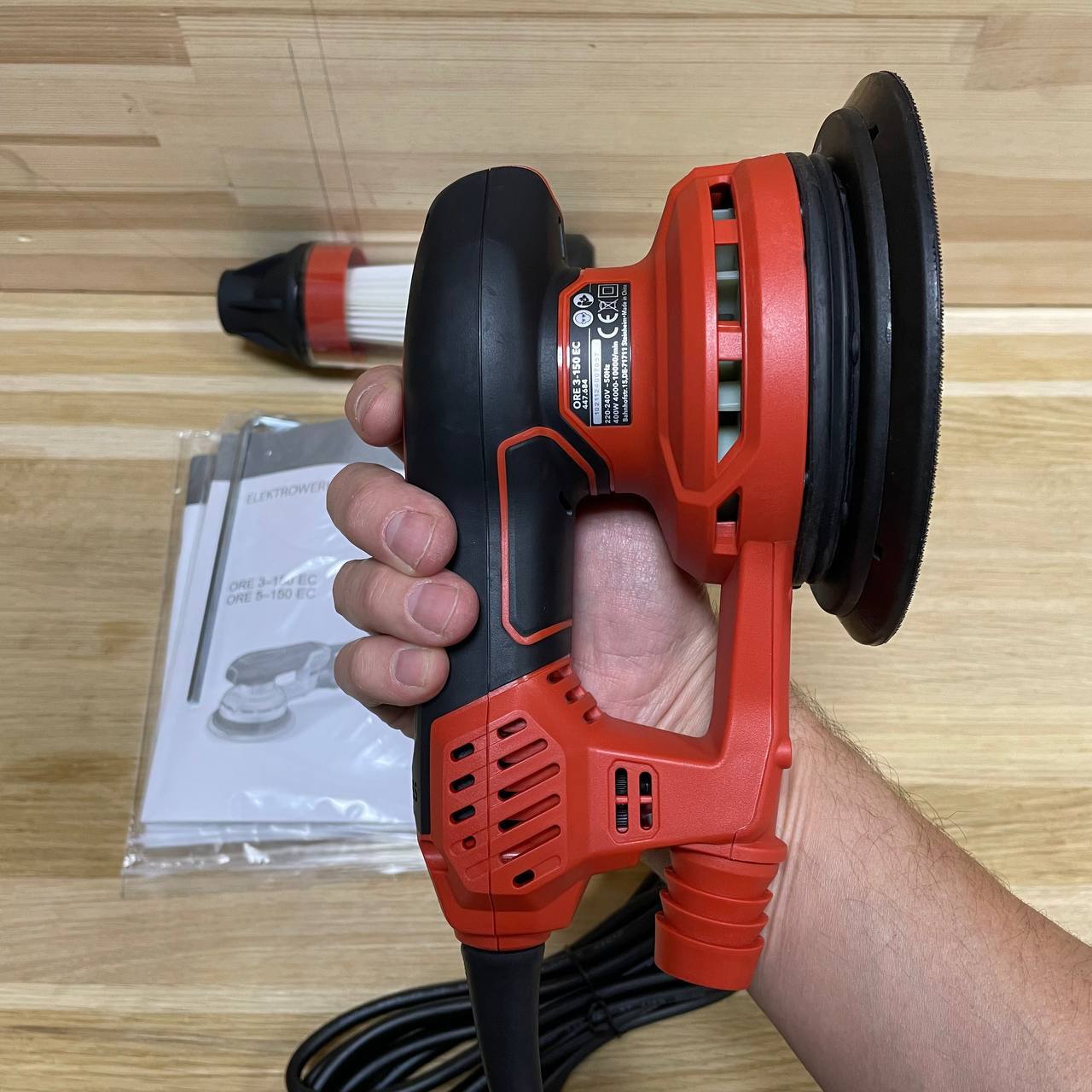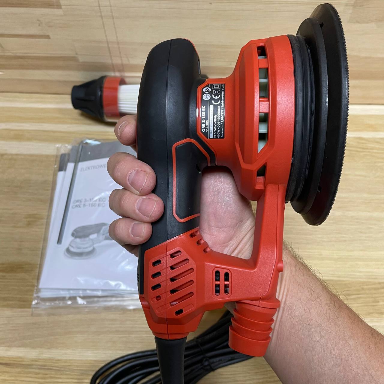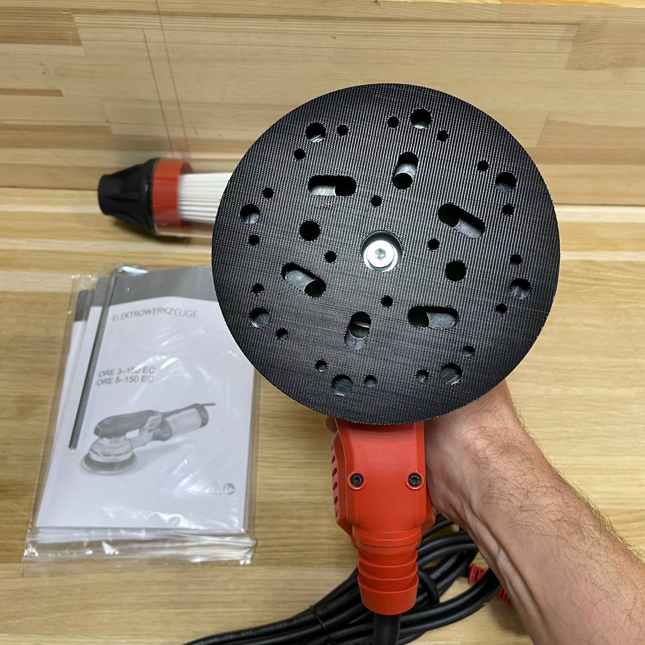 Скорость шлифования для каждого конкретного материала можно выставить путем регулировки частоты вращения. Частота вращения на холостом ходу 6 000 - 10 000 об/мин. Ход машинки 5 мм. Диаметр тарельчатого шлифовального круга 150мм, крепление круга - велкро. Для удаления пыли и шлама есть возможность подключиться к внешней системе пылеудаления D 27 мм. Оборудована дисковым тормозом, что позволяет избежать образования шлифовальных рисок. Легкий вес, компактные габариты, не трудно работу над головой. Вес 1,65 кг.