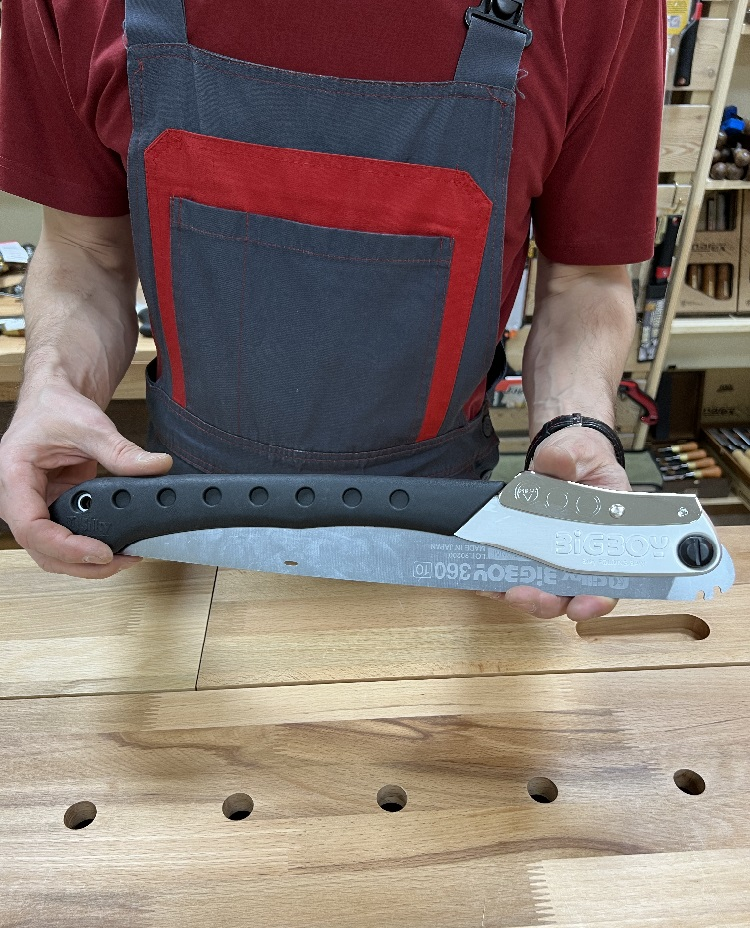 Зубья направлены к рукояти, что позволяет легко запиливаться с получением чистого и ровного реза, благодаря чему сырая древесина быстро сохнет без загнивания.