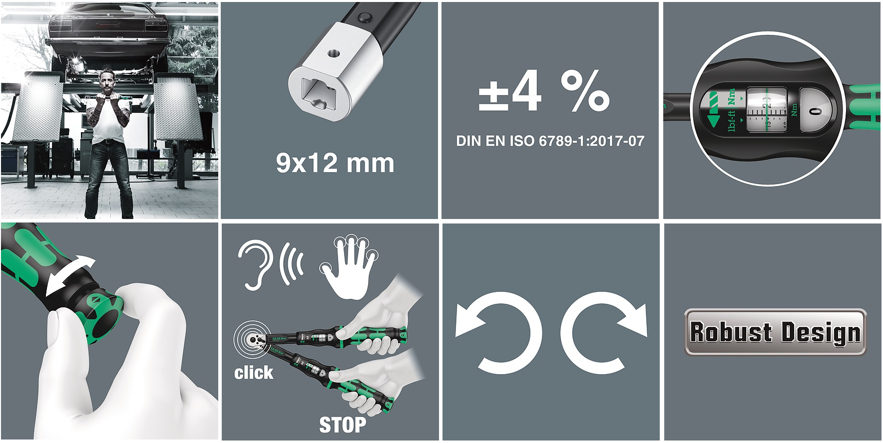 Для правой и левой затяжки und с приёмным гнездом 9x12 мм для установки соответствующих сменных инструментов.