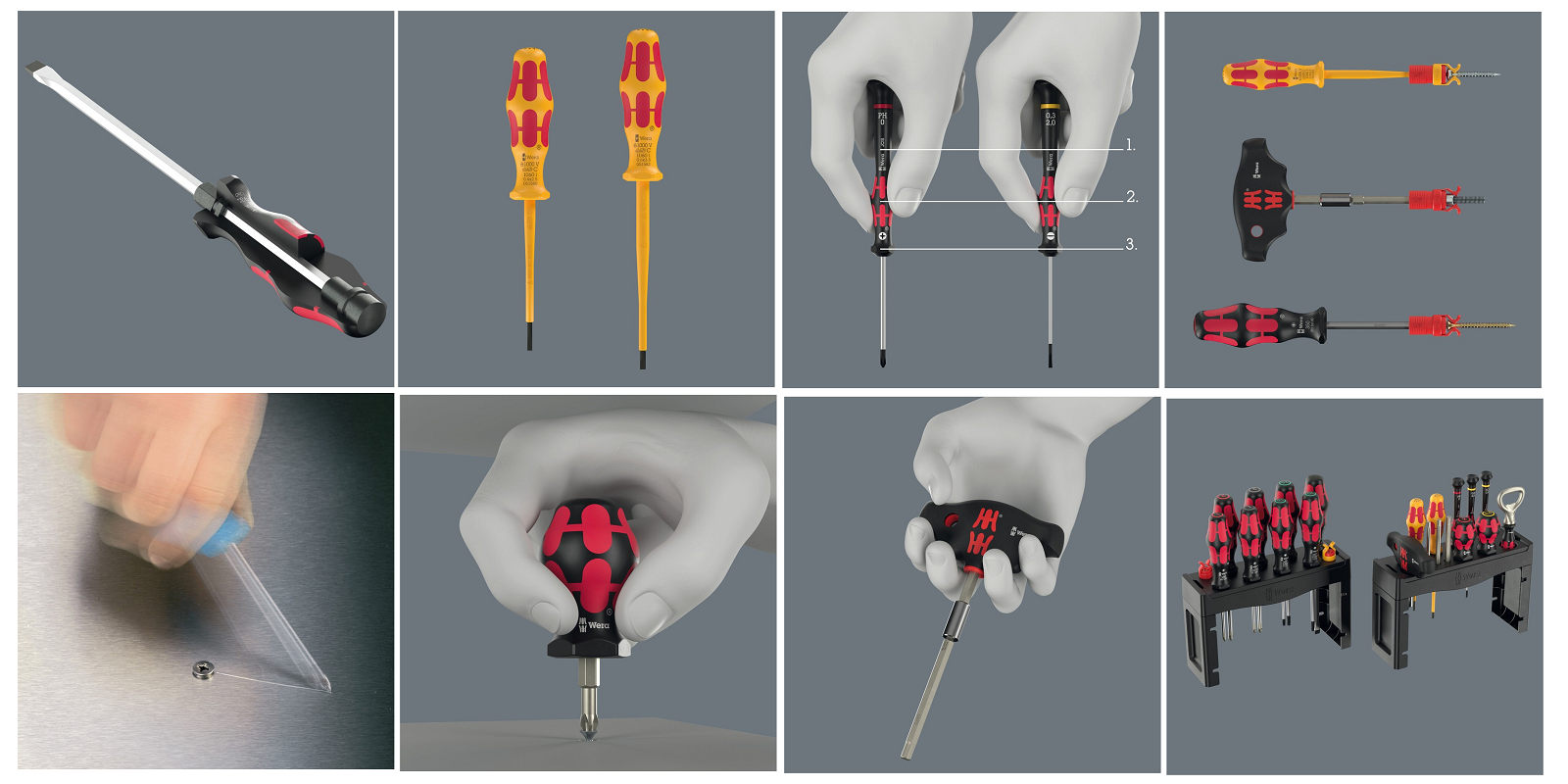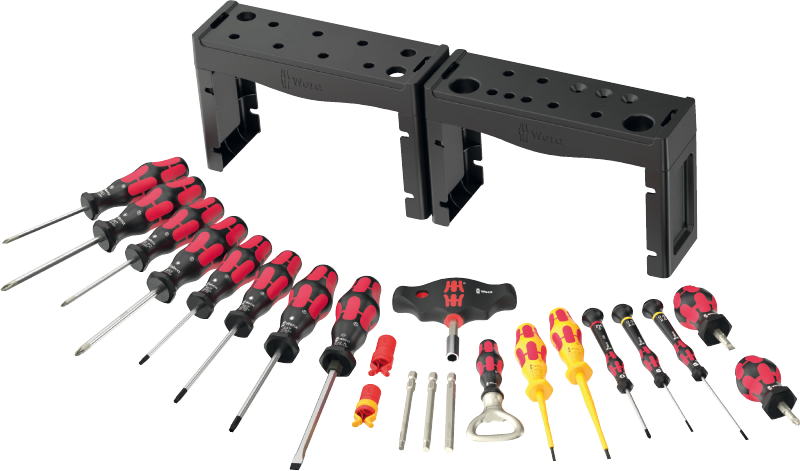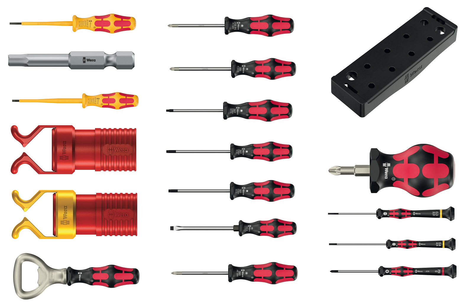 - 15 отверток, 2 из которых с плоским шлицем для VDE, 2 Stubbys, 3 мини инструмента для тонкой механики и отвертка-резец с ударным наконечником и сквозной насадкой.