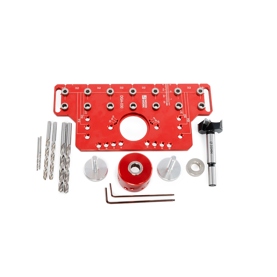 Кондуктор сверлильный Вудворк для установки мебельных петель Ø 35 мм и отверстий под полки с шагом 32 мм.